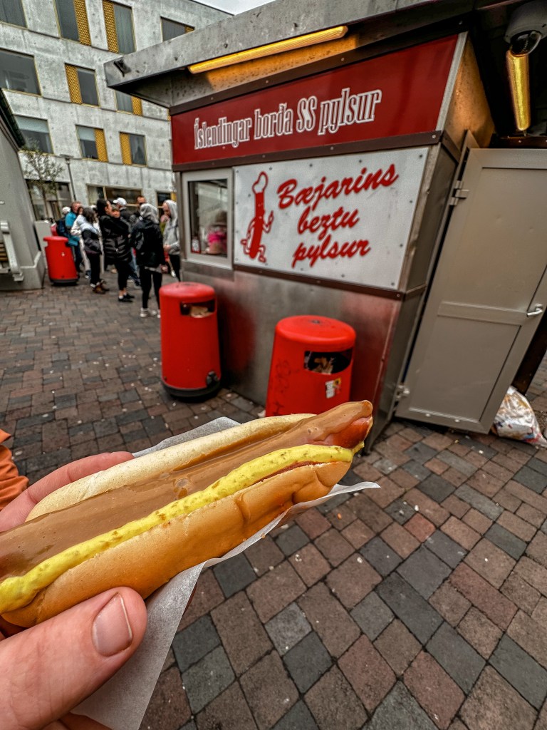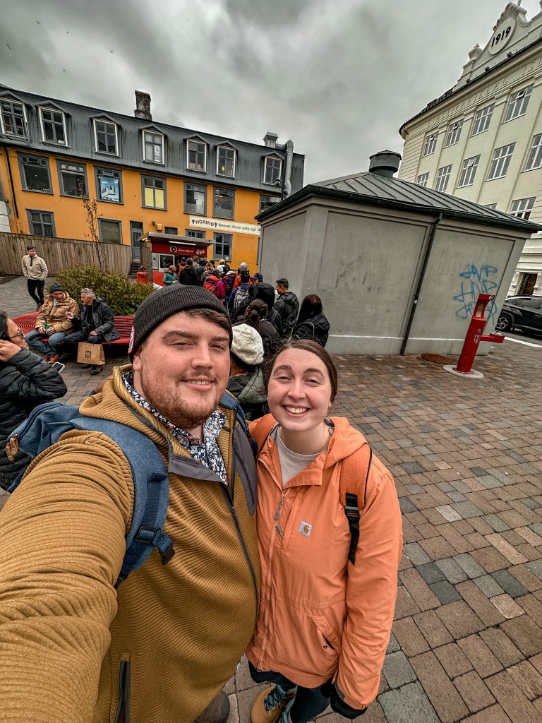 Luckily, soup isn’t completely filling, so it was time to make our way back over to the hotdog stand to try one of these Iceland hotdogs people are raving about. It was now around 1:15, and the long line that can usually be seen leading up to this hut was now fully formed. We were willing to wait, however, because we didn’t know if we would be over in this area again or have another chance, and it was another thing we for sure wanted to do. We only ended up waiting about 20 minutes before it was our turn to order. Since we had just consumed a huge amount of remarkable soup, we decided to only order one hotdog with everything to split. When you order it with everything, it comes with both raw and fried onions on the bottom, remoulade, ketchup, and sweet mustard on top. In the end, we could have definitely each ordered our own because it was very good and definitely worth all the hype!