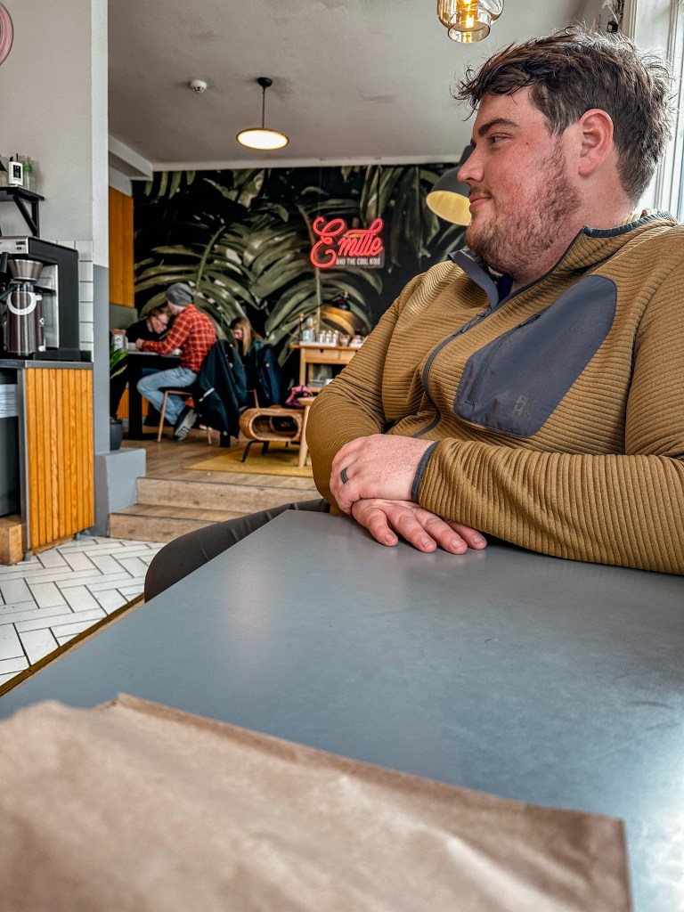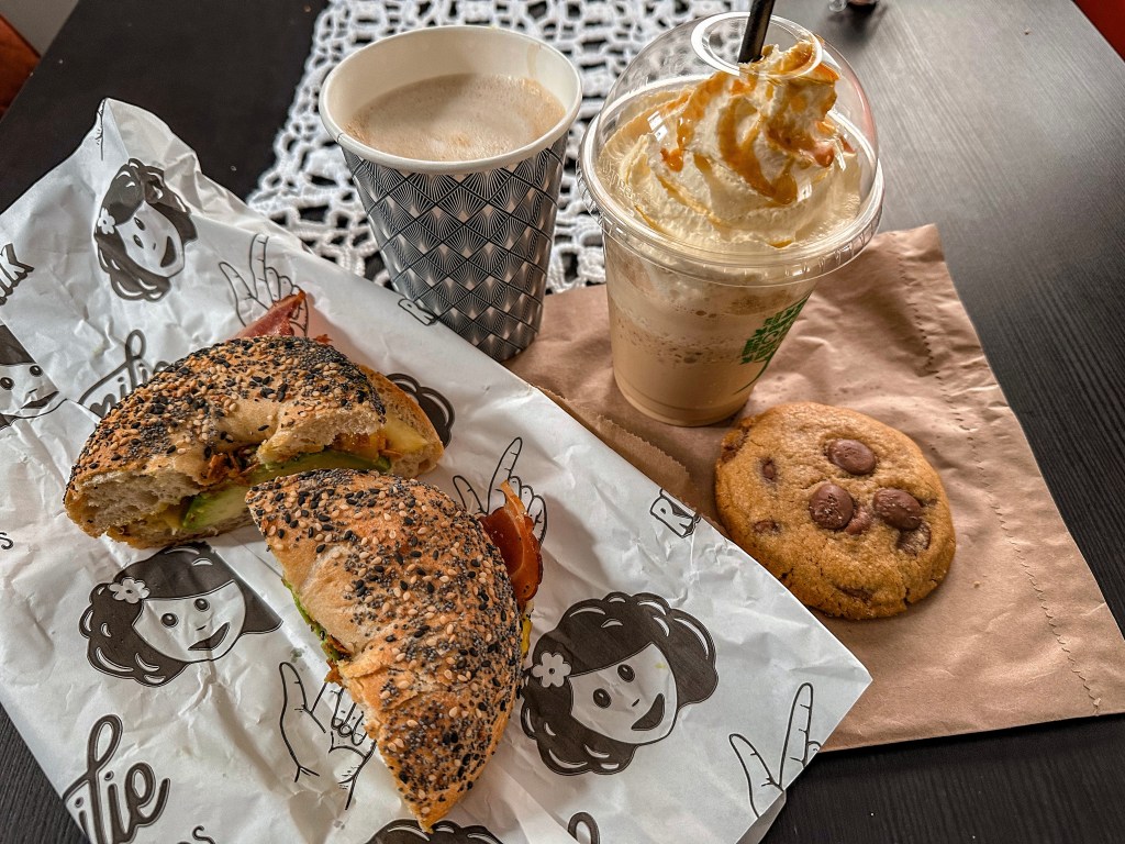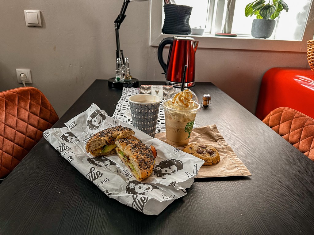 While finishing our shopping adventure, we found another gift for a family member and a Rainbow Road sticker and pin for us. Finally, it was time to head back to our Airbnb to relax for a little bit. Meal time rolled again once more, and we walked over to a cafe called Emilie and the Cool Kids where we ordered coffees, (hot for me and blended for Luke), a bagel sandwich, and a chocolate chip cookie. We collected our goodies and returned to our temporary home with our delicious treasure. We ate and began to wind down for the night in preparation for an early morning to catch our flight to Oslo, Norway. We got all our things mostly packed up. Then we made sandwiches to use up our extra ingredients we had gotten at the store two days before. We had a quick panic about whether or not we would be able to save our chocolate to bring back home. Lastly we watched another stand-up special from the same comedian we had watched our first night before calling it a day.