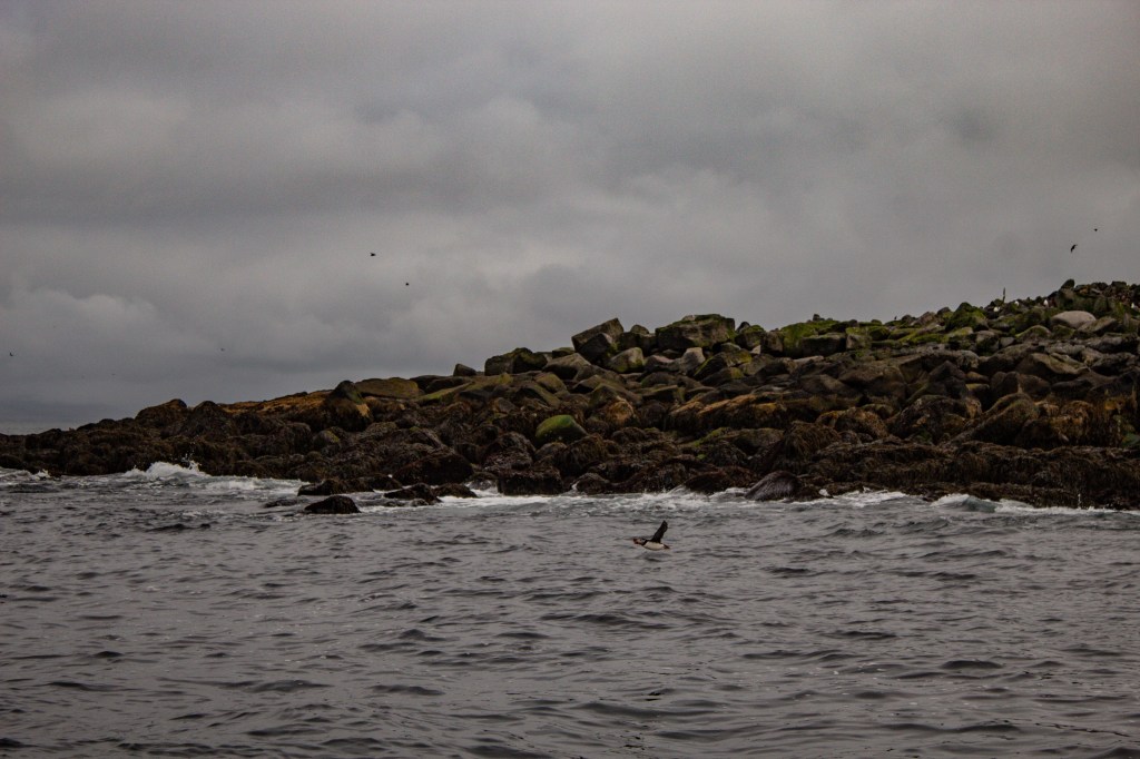 However, as we continued to make our way around the island, large colonies of Puffins began to appear. I switched back and forth between using the binoculars and my DSLR camera to watch the charming and delightful little birds. Many of us stood up to get good views and pictures, but it seemed like very few of the tourists knew how to stand on a floating boat. They would lock their knees and lose balance quickly, so a majority of them ended up retaking their seats or supported themselves with railings. I knew the importance of keeping your knees bent and rocking with the boat, so I was able to stand during the entirety of our time circling the island and was able to get some pretty decent pictures! My favorites were the ones I got of the Puffins mid-flight (yes, they fly and are quite quick) as they swooped down to the water near us. They even got close enough to make out the bright and distinctive colors of their beaks.