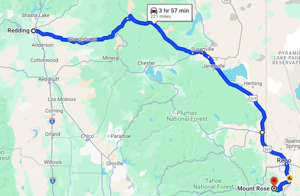 We stopped in Redding, CA at a Walmart to restock our coolers with food and beverage. We were camping on Mount Rose, NV ( just south of Reno, NV) that night and needed groceries for dinner. Redding greeted us with a blustering 104 degree day and zero wind. We did not spend much time in that air-fryer of a city.