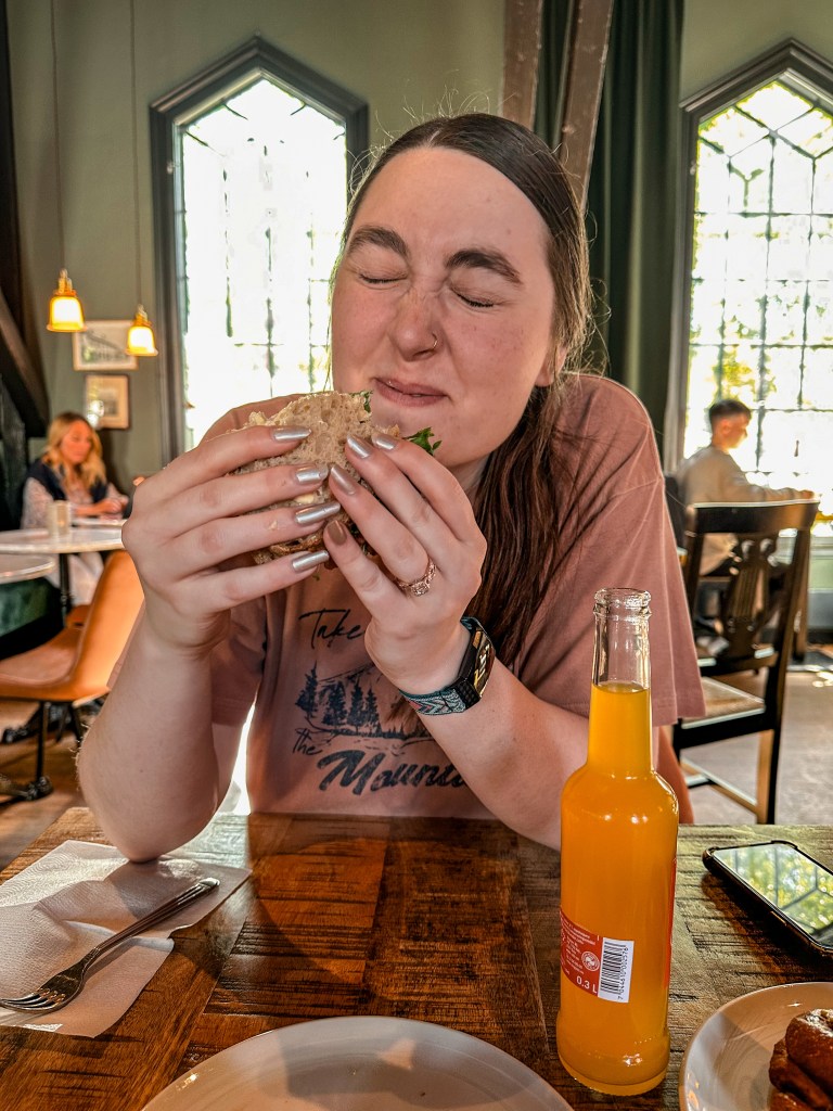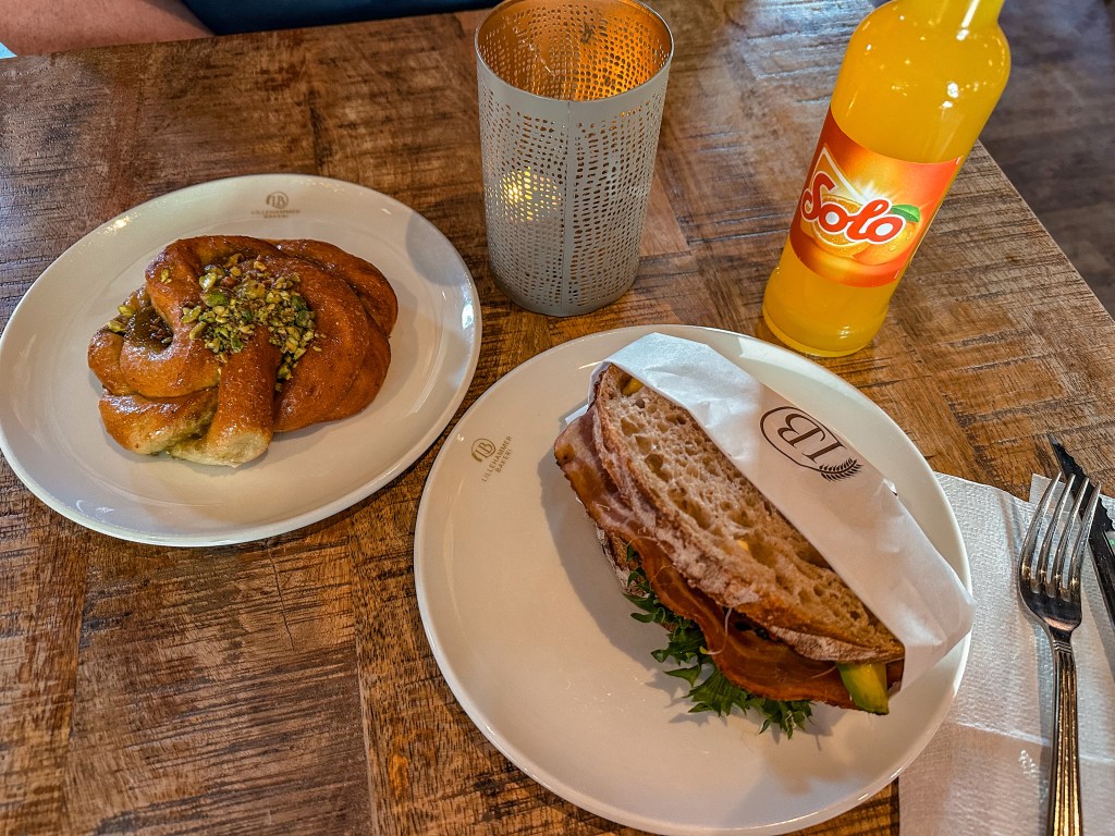 So of course our first stop was to get some food at the Lillehammer Bakeri! We were lucky enough to hit it at the perfect time before the crowds flocked in. Everything in the cases looked absolutely delectable. We decided to make sure to get some nutrition from one substantial food item but also treat ourselves to one sweet baked good. We settled on a delicious looking BLT sandwich, pistasjbolle (pistachio bun), and another Solo to wash it down. It was absolutely amazing and not hard to see why people were lining up into the street to get a taste of these baked goods.