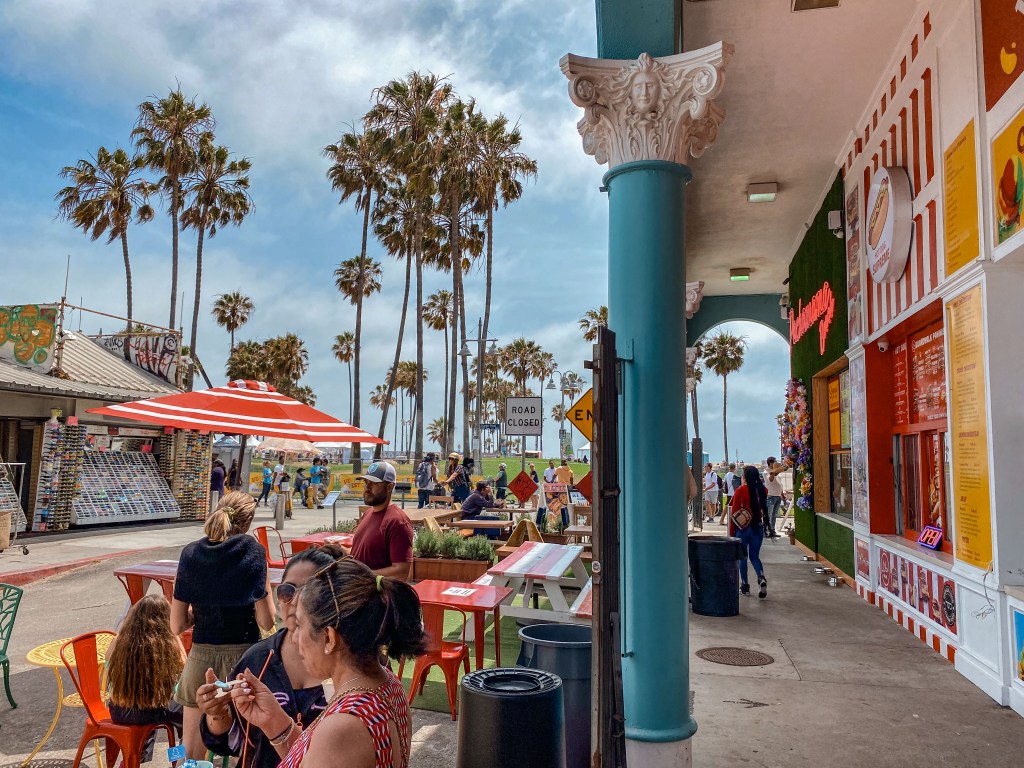 We made our way over to Venice Beach. It had been cloudy all morning, but the sun finally started to peek out when we parked at the beach around 2:00pm. It was a bit of a drive over and tough to find a parking spot, but we finally got lucky and made our way over to the busy part of the beach. It just so happened to be even busier because there was a Pride event going on. We didn’t even think about how it was Pride Month and that there might be some festivities going on. There was a fenced off area that required tickets to enter and participate in all the extra things going on. If we had known, we definitely would’ve made a plan around coming earlier so it would be worth it to buy tickets and enjoy the fun. However, since I think it was $20 per person, and we only had about an hour, it wasn’t quite worth the cost at that point.