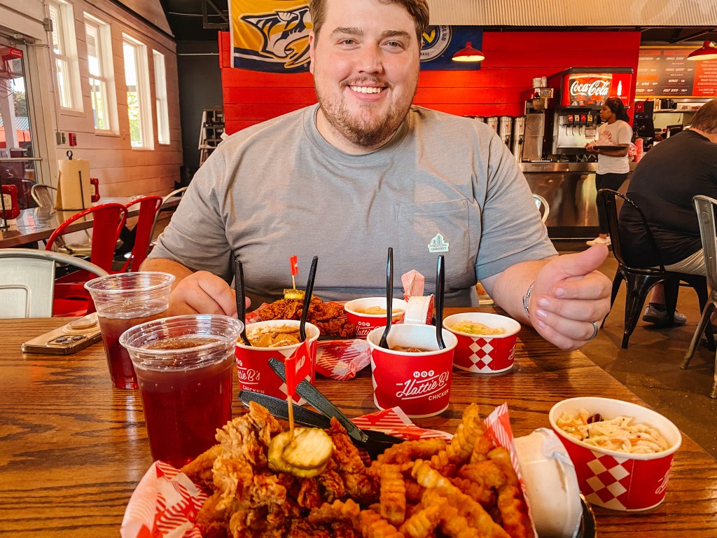 We did our usual routine of getting settled a little bit and letting our bodies recover from the natural tenseness that comes with traveling, despite how much we enjoy it. We had bought Zanies tickets for the 7:00pm show, and it said doors opened 45 minutes before. Our seats weren’t assigned, and we wanted to get there right when doors opened, so we wanted to make sure we gave ourselves enough time to have supper and get to Zanies by 6:45. Another pro of the location of our Airbnb is that it was right down the street from one of the locations of the iconic Hattie B’s Chicken! We made the short walk over and were walking into Hattie B’s around 5:00.