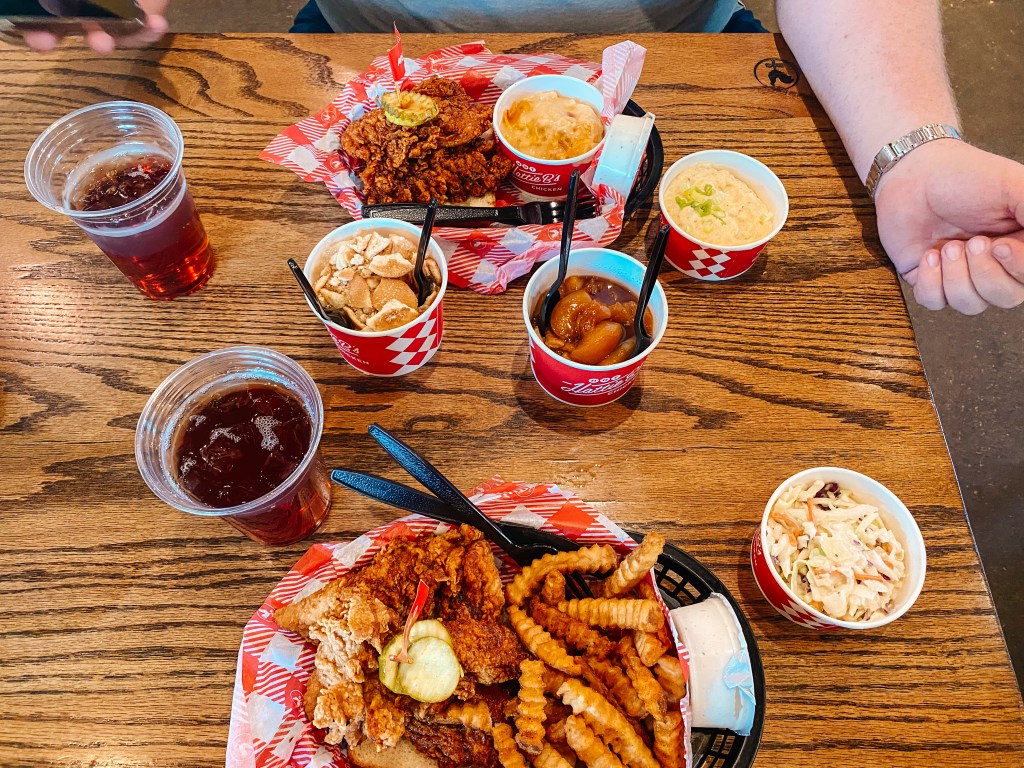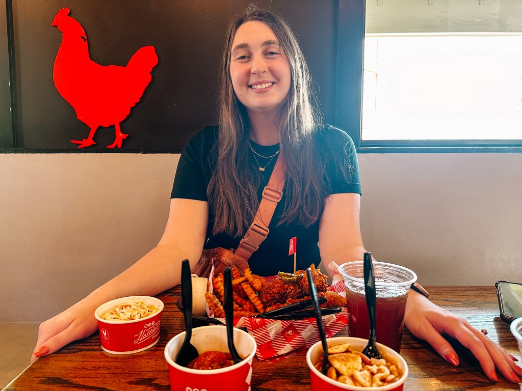 Deciding what we were going to order for our first meal in Nashville was a little tricky, but we had been preparing for this moment for a while with all the research we had done and videos we had watched. However, we also wanted to try a little bit of a lot of things, so we had a very full table in the end! For our chicken tenders, our main course, Luke went with Medium heat, and I wasn’t feeling as brave, so I went with Mild. For sides, we shared bacon cheddar grits, Mac and cheese, Cole slaw, and fries. For drinks, we had to go with a southern classic, sweet tea. Finally, we enjoyed a banana pudding and peach cobbler for dessert.