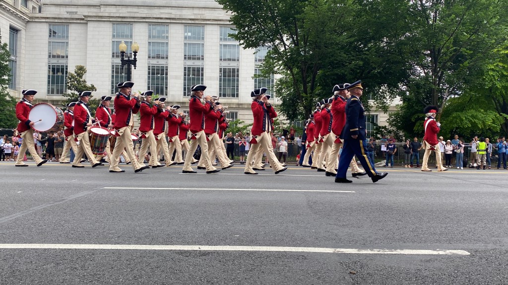Our group was allowed 6 grown ups including directors to walk with the band. We also had two chaperones carry our school banner at the front of our block. That left Samie and another chaperone to find a spot on the parade route and watch. They found somewhere close to the beginning and then followed us all the way to the end. Sam ended up taking a lot of excellent photos and videos of us and other groups in the parade. One of my favorite was this fife and drum company in traditional uniform.