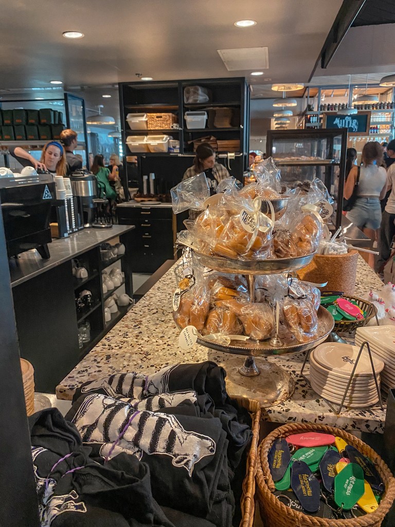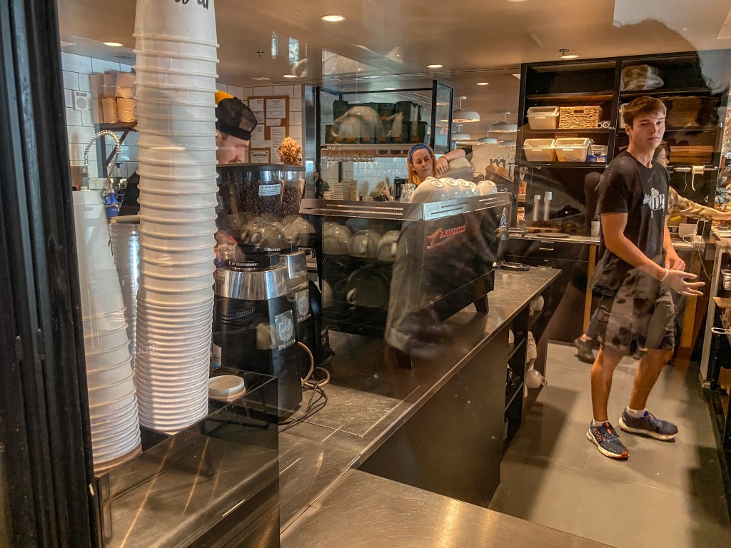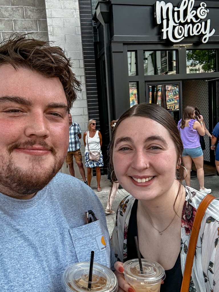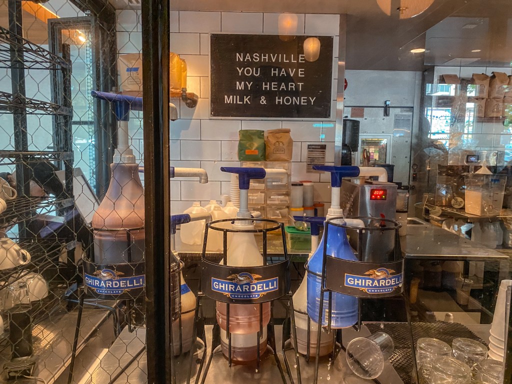 We decided this delectable dining destination would have to wait for another time. We continued down the street to another location whose name had come up often while looking into places to stop in for coffee within The Gulch. This other coffee shop is called Milk & Honey. Upon approaching, we were once again taken aback to discover how bustling it was! All the brunch tables were filled, and there was a line that stretched around and took up much of the walkway as we walked in. However, there was a side for sitting down to order and eat, and a side that was specifically designated for grab and go coffee. We opted to pass on food here since we had many other filling food places on our list for the day, and we would just order some coffees to take with us on our walk instead.
