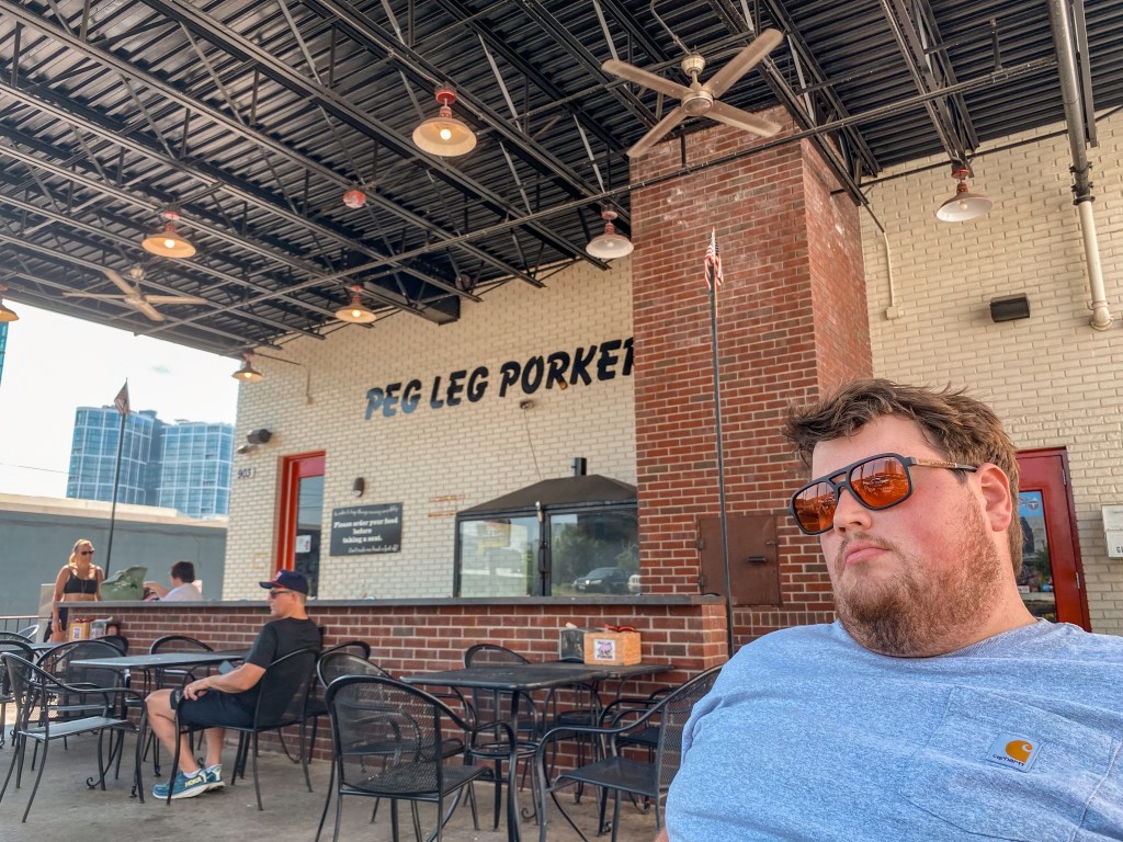 After getting our lovely mural photo, we continued our walk over to our first official food destination of the day as we sucked up the last sips of our coffees. We arrived at Peg Leg Porker a few minutes before opening at 11:00, so we took a seat at one of the tables outside to wait patiently, along with a few other people that wanted to get in right away as well.