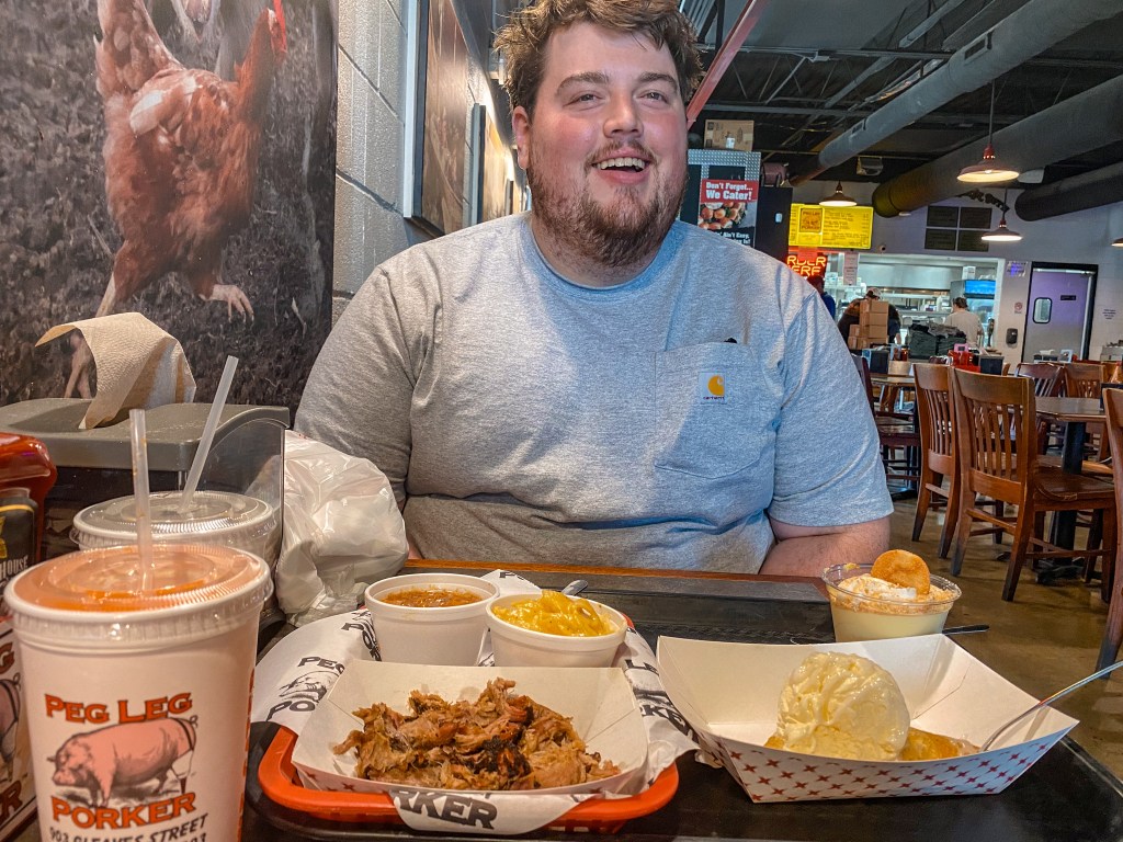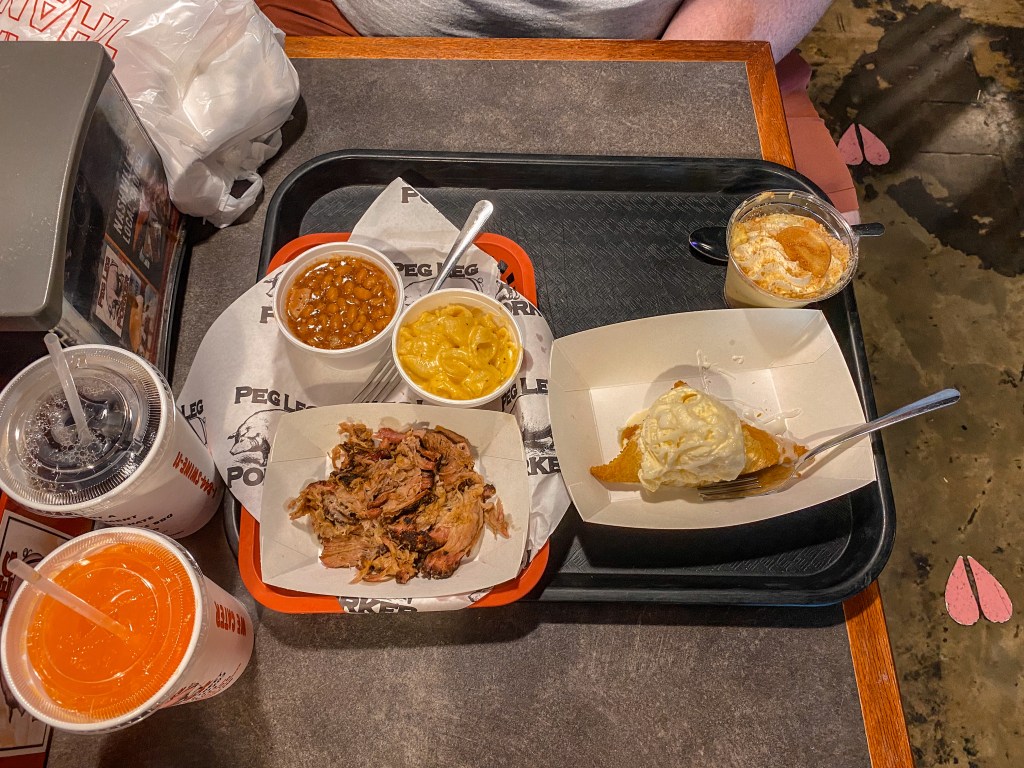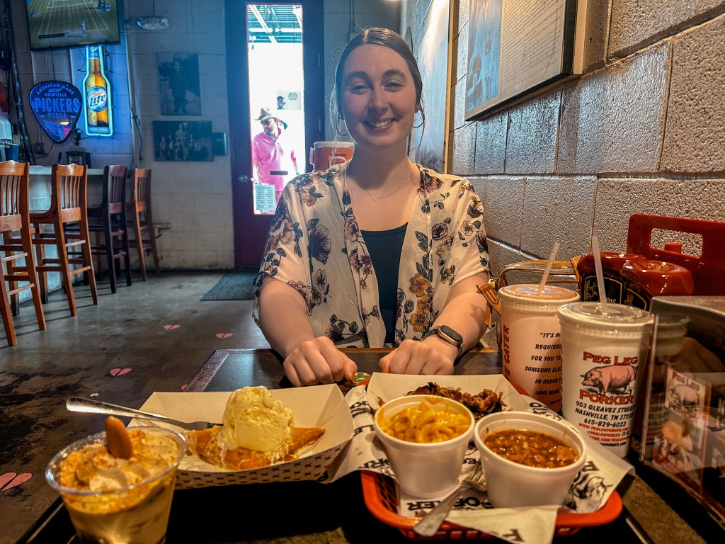 As soon as carried the tray to our table, we were salivating at how delicious everything looked and smelled. However, taste is the most important part, so we were eager to dig in! Now, Peg Leg Porker already had some pretty big shoes to fill after the wonderful experience we’d had at Hattie B’s a few days earlier. While Hattie B’s is still high on our list of our favorite places we ate at during this trip, it has to concede the crown to Peg Leg Porker. If we could only recommend one food stop to someone wanting to visit Nashville, this would be it. Everything was absolute perfection. The pulled pork was juicy and tender. The BBQ beans were saucy and smoky. The mac and cheese had a sharp natural cheese taste instead of the super orange artificial stuff. The banana pudding was just as sweet and refreshing as we remembered. And the fried pie was “chef’s kiss”!