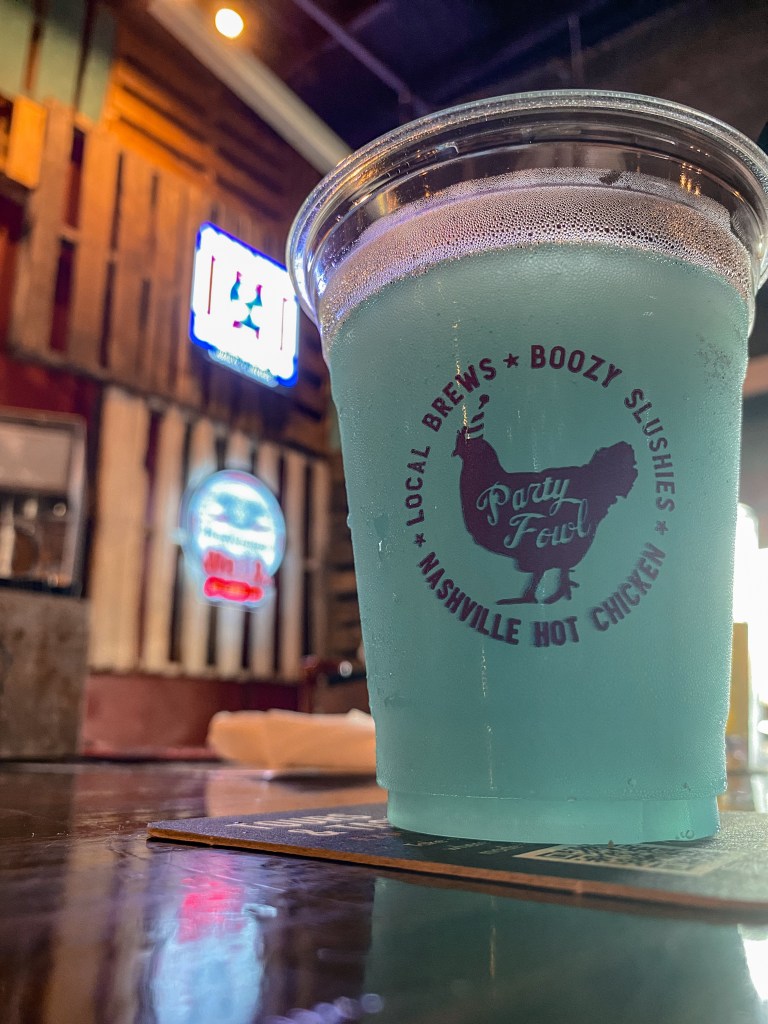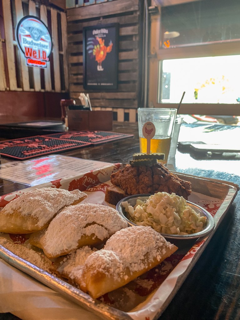 One of their specialties that I had already decided I was going to order before even going inside because it was largely advertised on a banner outside was a boozy slushie. When in doubt, I always go blue, so I went with blue raspberry! Luke decided to try a locally brewed beer called “Dill With It”, a dill pickle kolsch. For food, we of course had to sample their hot chicken since we were eating our way through lots of different hot chicken of Nashville. There was one option that particularly appealed to me. They had a hot chicken and beignets combo on the menu, and I had never tried beignets before but definitely wanted to try them because any time I had seen them (animated or otherwise), they looked delicious.