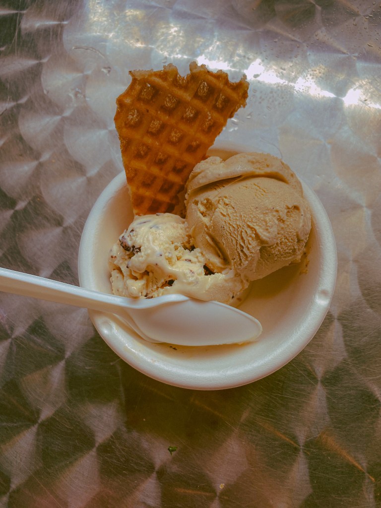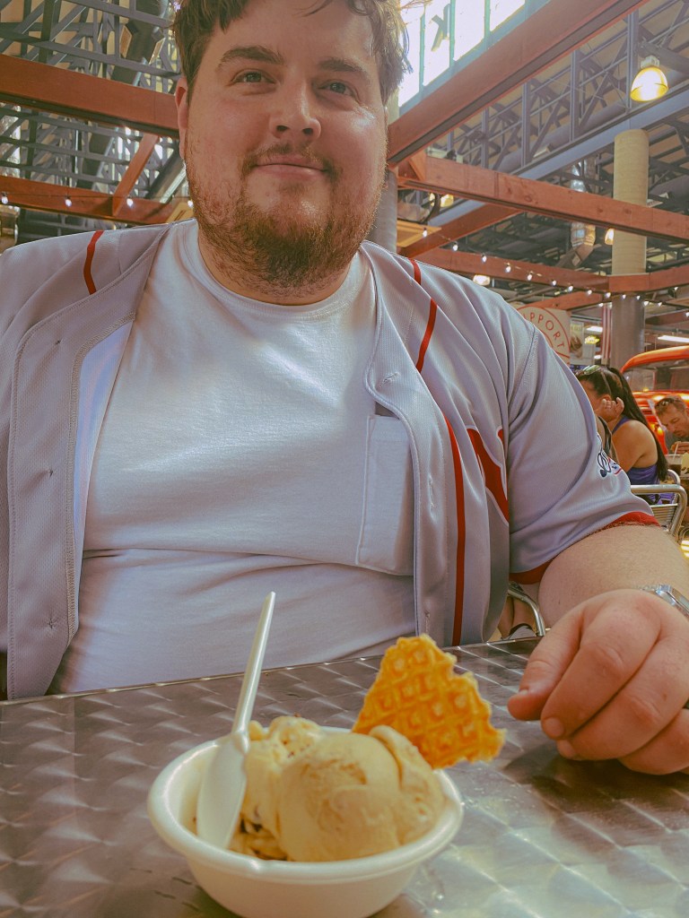 We had successfully heated ourselves up to quite a toasty temperature again, so when we got back to the market, ice cream (along with a bottle of chilled water) seemed like the obvious choice to enjoy next. The heat was getting to me a little bit, so I took a seat at one of the open tables while Luke went over to Jeni’s Ice Cream to order us some scoops. He got a scoop of coffee with cream and a scoop of salted peanut butter with chocolate flakes. Even though I am definitely the bigger coffee drinker of the two of us, coffee ice cream is his thing. The peanut butter with chocolate was definitely picked with me in mind. They were both very tasty, sweet, and cold, pretty much exactly what we needed for a pick me up. The water also probably helped.