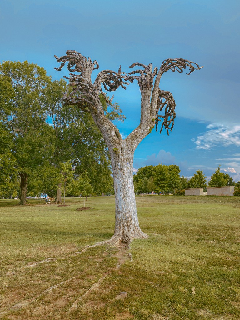 We continued walking toward the Parthenon and walked past a gorgeous and one of a kind sculpture! The artist, Anthony Heinz May, takes parts of dead or dying trees, cuts them into fragments at a different location, and then brings them back and reattaches them in a way that makes it appear as though the tree is dissolving! It’s very cool!