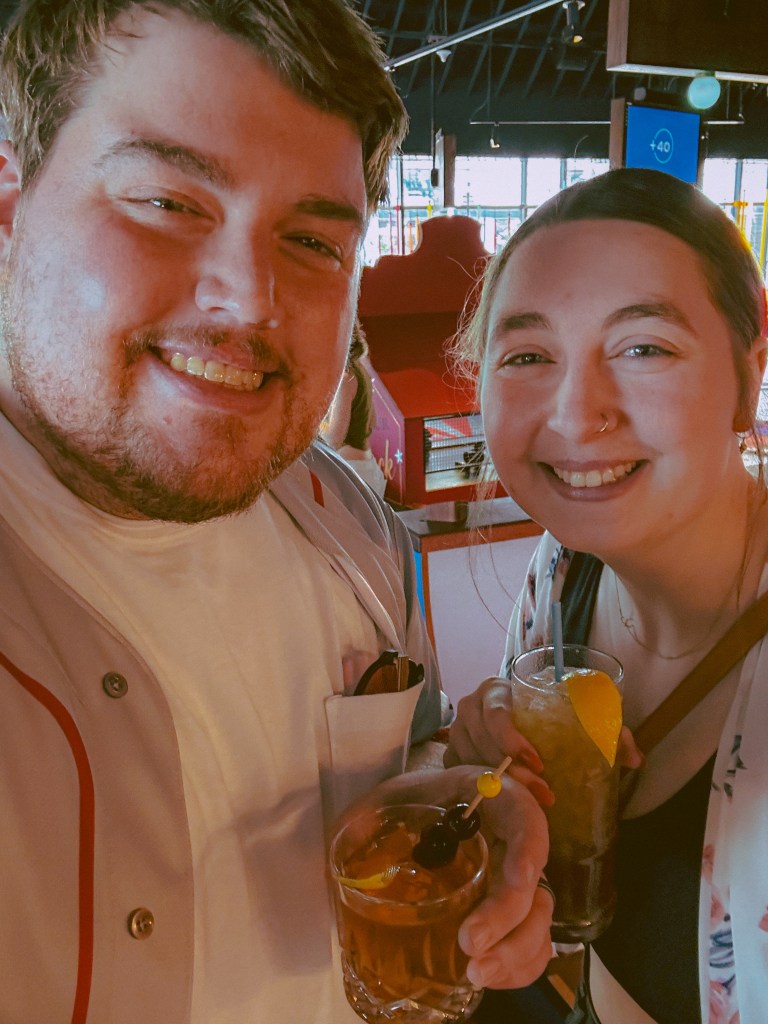 In fact, it was so much fun that we ended up going back to kiosk to purchase another round! While playing our second round, we were approached by an employee that asked us if we would like to order a drink while we played that they would bring to us when ready. We were still in Nashville after all, so of course we couldn’t say no! I ordered a Peach Tea on Peach Tree which was Puncher’s Chance Bourbon, Helix7 Vodka, Ole Smoky Tennessee Peach Whiskey, Disaronno Amaretto, peach purée, cold-pressed lemon juice, and Coca-Cola. Luke ordered a Perfect “10” Old Fashioned which was Russell’s Reserve 10-year-old Bourbon, orange & lemon peel, DeGroff’s Pimento Bitters, Demerara syrup, and a signature ice ball. They were both absolutely delicious, and I would especially recommend the Peach Tea on Peach Tree!