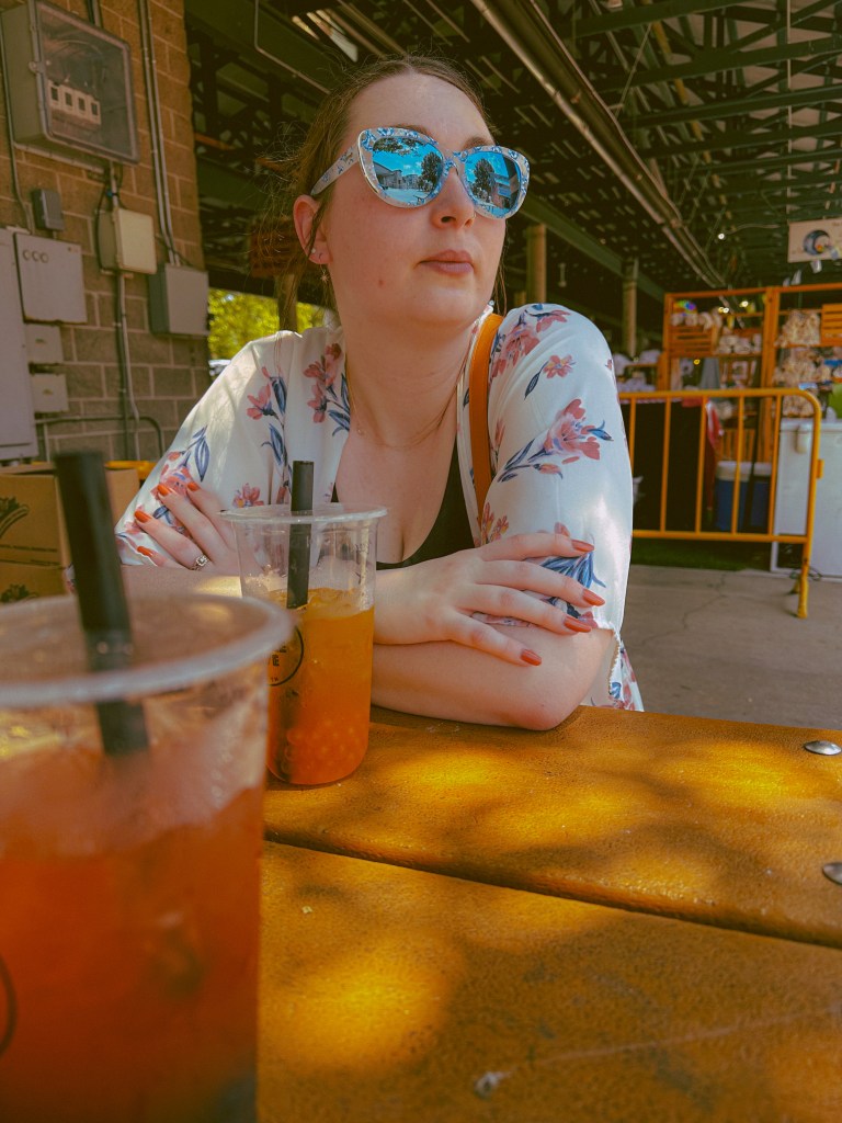 After getting my fill of greenery, we made our way across the outdoor Farmer’s Market to the inside building to cool off after our hot walk for a little bit. We figured a nice cool drink would hit the spot, so after checking out some of the different places available, we decided our first stop would be at Bubble Love for some bubble tea! Luke got a strawberry fruit tea with blueberry popping boba. I got a peach fruit tea with mango popping boba. We then got to enjoy stabbing our special boba straws thorough the seal.