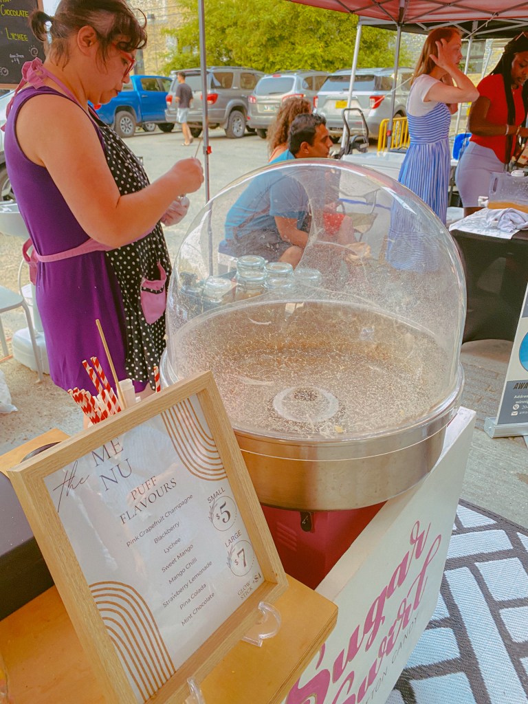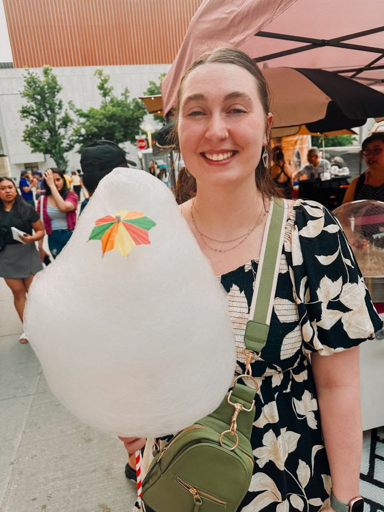 I had also seen a cotton candy stand, and I absolutely love cotton candy. Believe it or not, I used to be a figure skate and would participate in my home-towns local ice shows. One of my fondest memories of these shows is that when they were all over, they would come back to meet the performers with a huge garbage bag of all the extra cotton candy that hadn’t been sold, and we would be able to take a couple home! This left a very special place in my heart for this sweet treat, and I try to indulge whenever I can! This stand has some especially irresistible flavors, and I ordered a large sweet mango. I was pleasantly surprised at how big the large actually was and turned more than a few heads as I walked down the alley with it.