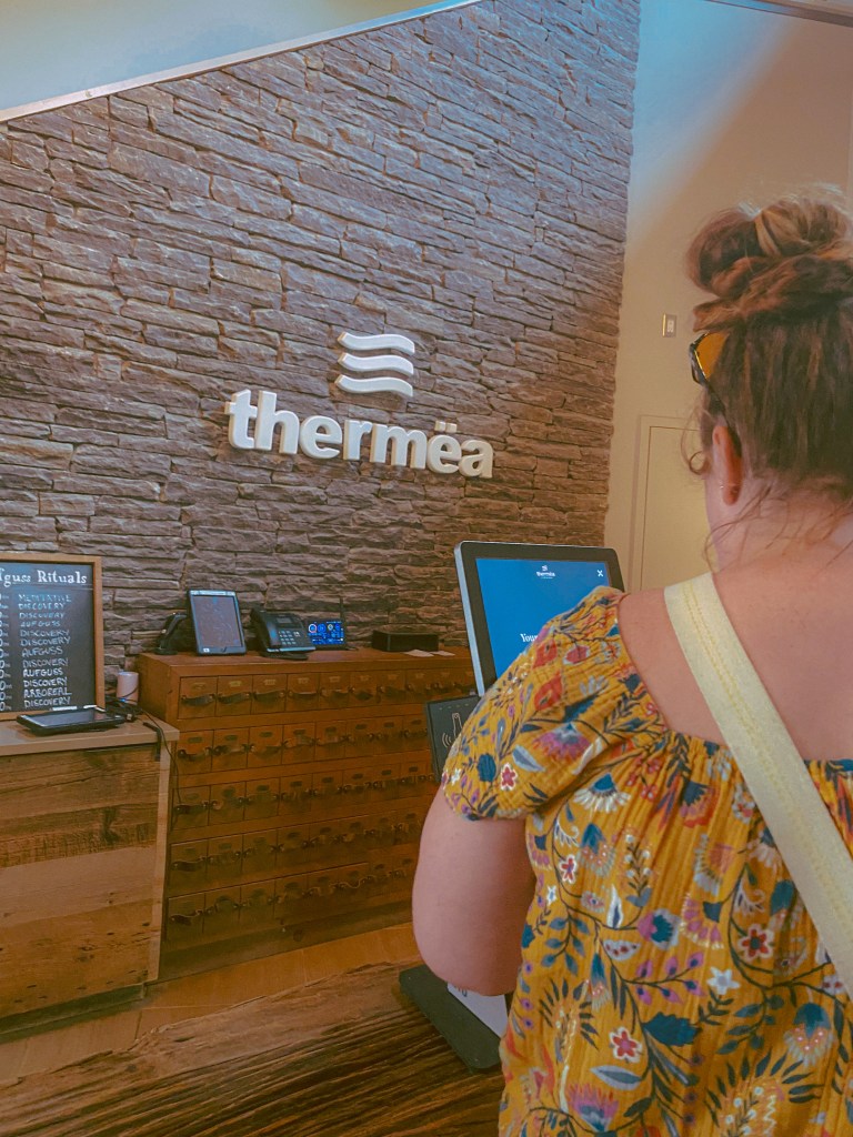 We parked and were walking up to the Thermëa Spa building about 10 minutes before 2:00. We got checked in and received our spa bracelets where we could charge any extra purchases to (similar to the Blue Lagoon in Iceland) during our time there. The lobby and outside the building is the only place that phones are allowed. Upon entry to the locker/dressing rooms, mobile devices have to be stored and locked in your designated locker. This contributes to the peacefulness and tranquility of the spa.