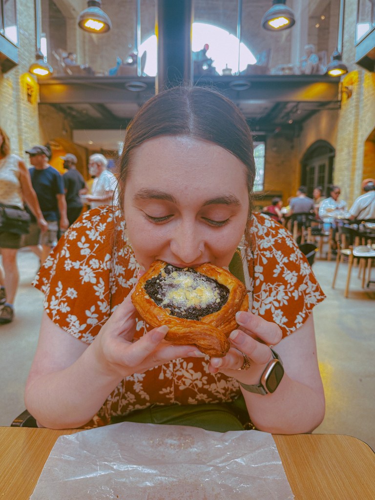 Along the way, we found some things we wanted to try for lunch. Luke visited a few placed to get some poutine and a hot dog from Wienerpeg, and I stopped at a bakery called Tall Grass Prairie Bread Co. where I got a cheesy bread twist and fruit pastry. I also got a pecan square for later. Our meal was very tasty and enjoyable!