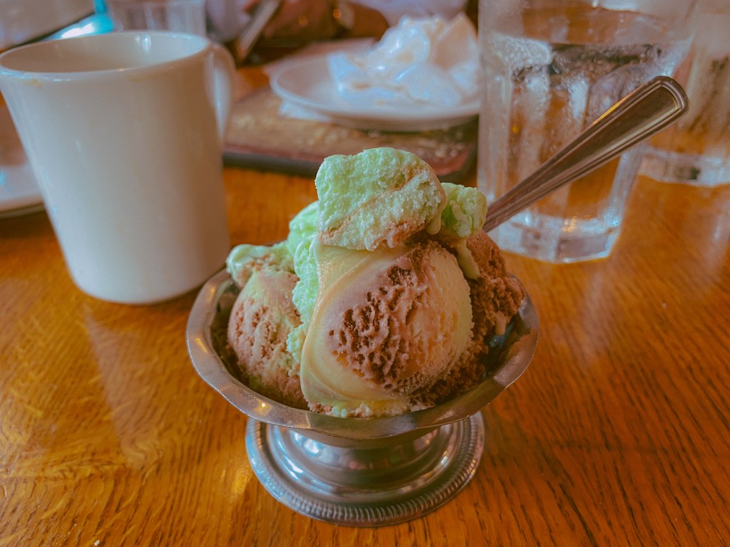While the meal and coffee were very pleasant and enjoyable, my favorite part had to be the spumoni ice cream! I had never heard of this flavor before, but it very quickly became one of my favorites! Their spumoni was a mixture of just chocolate and pistachio (sometimes cherry can be an included flavor, but I don’t particularly enjoy cherry flavoring, so I was more than fine with just the two). I had recently had some pistachio ice cream on our trip just about a week earlier to Nashville, and I discovered that I really really like pistachio ice cream. Apparently, it’s also delicious mixed with chocolate!