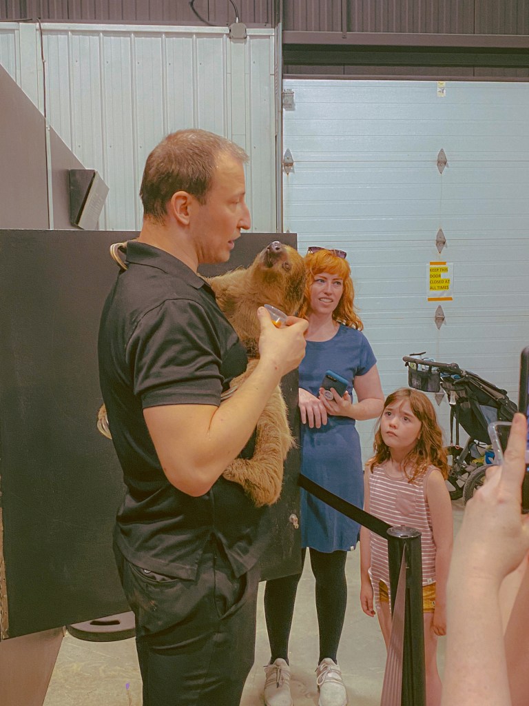 Since we didn’t have a specific game plan, we started by just choosing a direction to start making our way around the walking path. We came across the kangaroo exhibit first where you walk through a set of double doors and can actually enter the habitat and walk around within a designated area of the kangaroo enclosure. It was a very warm July day, so the kangaroos could not have been less interested in us as they lounged in the cool shade. After continuing, we found some coolness ourselves when we came upon the Discovery Centre. The building was air condition, and they just so happened to be starting their presentation on some of the featured animals inside. One of those featured animals was the cutest little sloth that of course made my list of top animals we got to see that day. You’ll have to check out the picture below and just see for yourself!