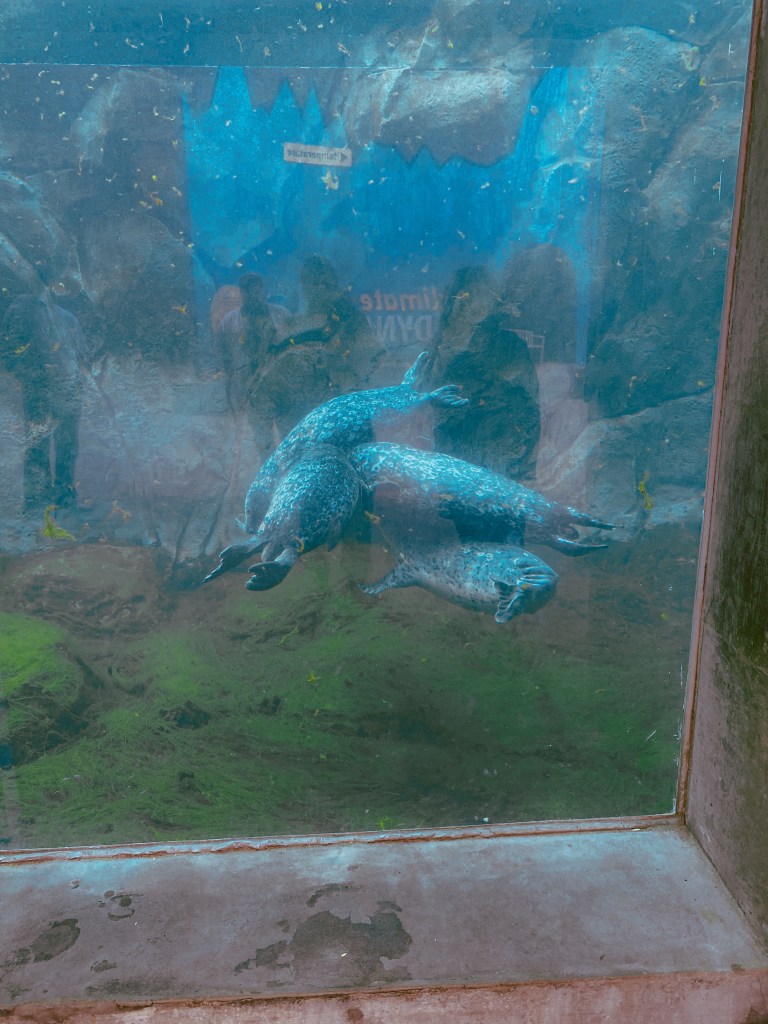 There was a gaggle of rowdy children crowded occupying all the territory in front of the viewing glass for a while, so I had to patiently wait and watch from a further distance until the youths moved on. It was then my turn to make my way up closer to the glass and watch with wide eyes and pure joy as the seals playful swam by, zipping and darting in a slightly different spot each time they passed, almost like we had our own little game. I made my way to another panel of glass that looked in on the seals, and witnessed what I would probably consider my favorite wild animal interaction. The four harbor seals pressed their squishy noses together in a circle, slowly let their bunch of bodies rise within the water, and blew bubbles in the middle of their circle that rose and churned above them. I easily could’ve stood and watch them all day!