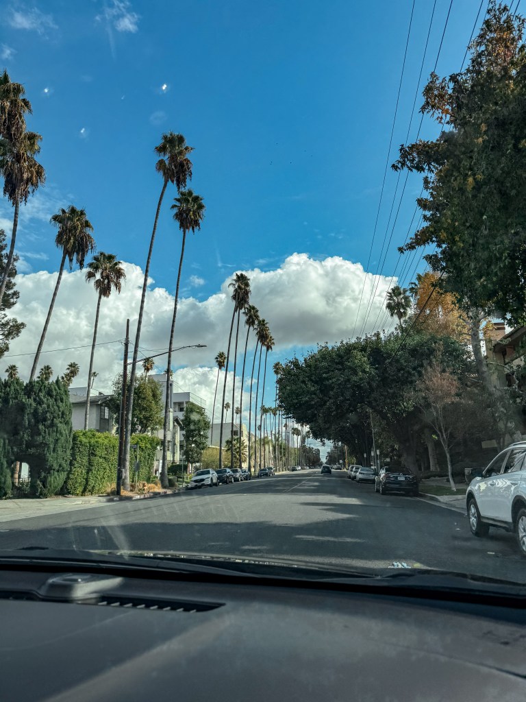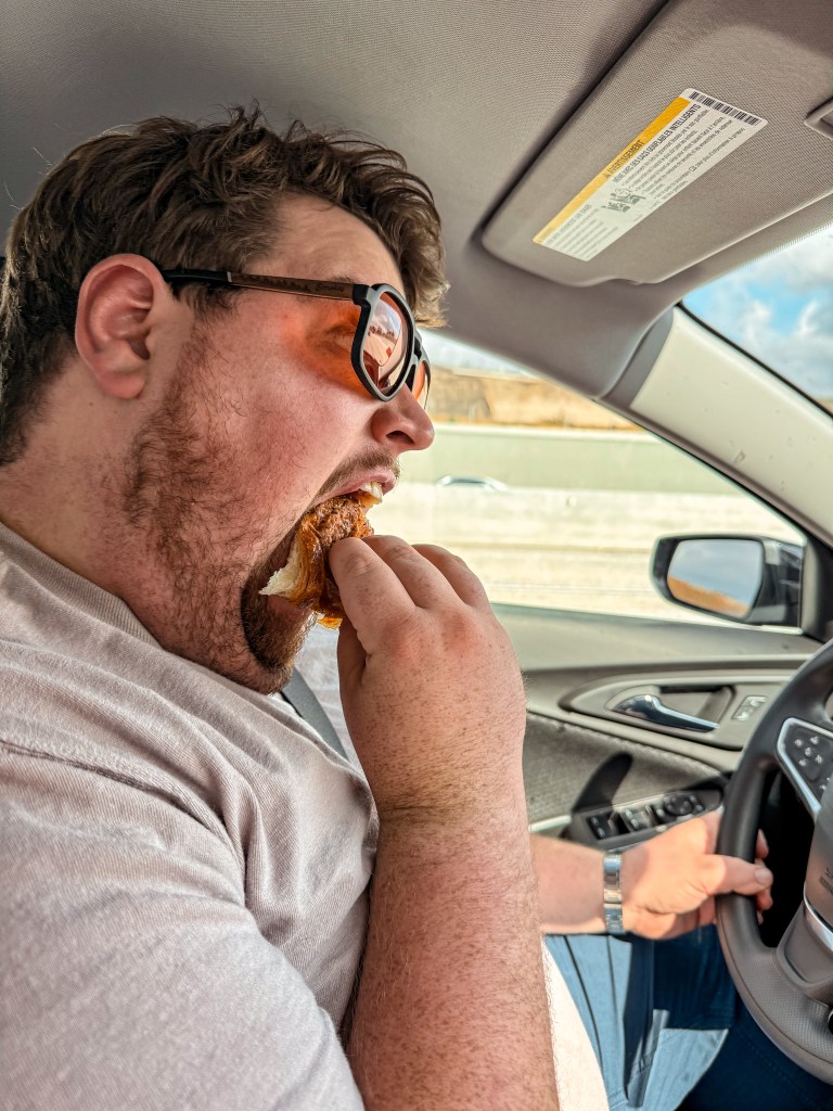 We had barely gotten on the road when I looked down and realized I didn’t have my crossbody bag. We had to made an immediate u-turn back to the apartment, where Alyssa met us out on the street to hand off my bag and also some baked chocolate chip banana bread she had made yesterday that she thought would make a good travel snack! Then we were back on the road! Before tearing into Alyssa’s banana bread, Luke had gotten his own breakfast during our time out and about and enjoyed getting to snack on that as we kicked off the drive through the Los Angeles palm trees, onto the wide paved interstates, and into foreign territory.