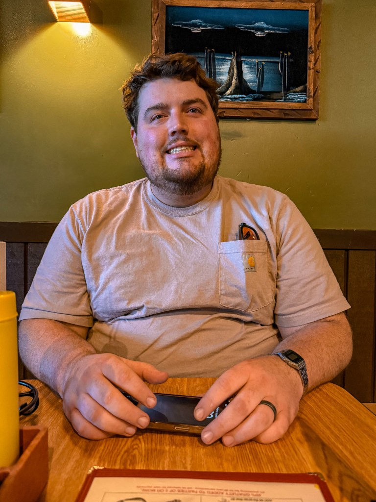 We would be arriving at a time where the lunch rush wouldn’t be to booming so that it would hopefully be easy enough to get a table. We knew it was a popular spot to eat, so we assumed it would be busy, but hopefully not overly busy was our goal! Sure enough, pushing open the door around 1:30 ended up being a great time arrive! There were still plenty of full tables, but we were also able to be seated right away at a small table close to the door. Luke took the both side, and I sat at the table side, facing the wall. I got to look at all the fun and unique desert artwork using a kind of fabric material that made them almost appear to glow!