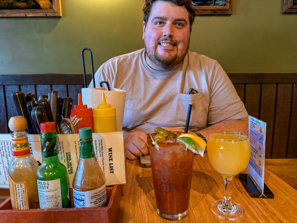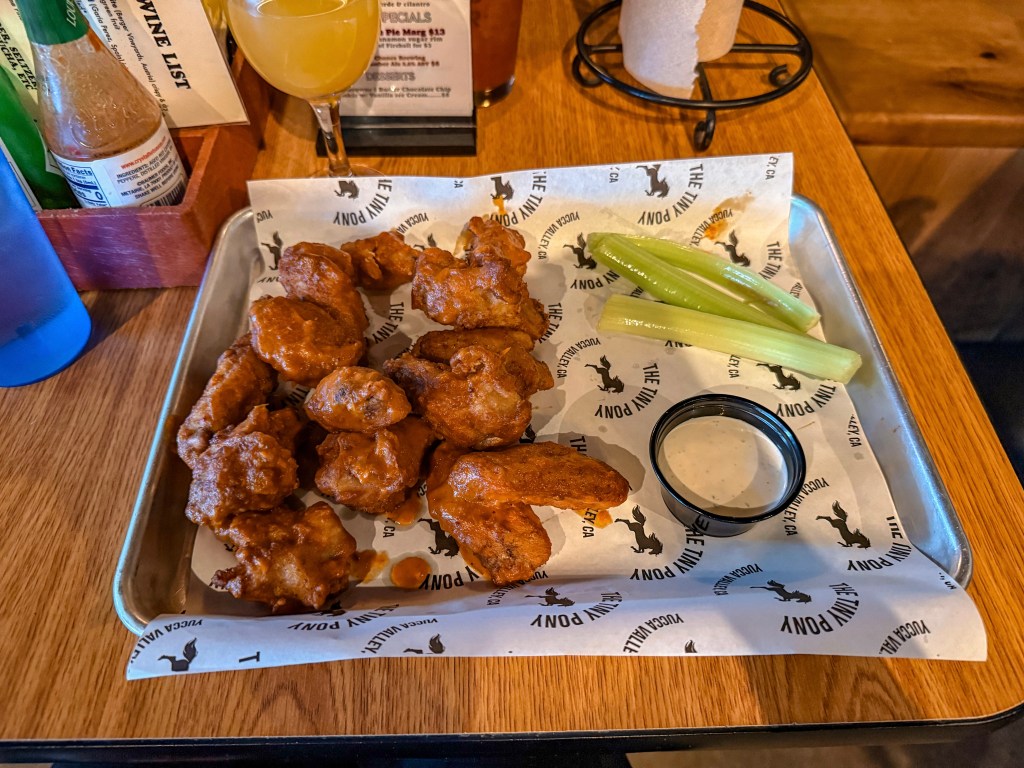 We started by ordering some drinks because there’s something even more refreshing about a nice, cold, alcoholic beverage in the middle of a hot and dry desert. Luke went with one of his favorites, a Bloody Mary, and I went with one of my go-to drinks, a mimosa. For food, I went with a classic bar entree and ordered a 12 piece order of buffalo flavored “Pony Wings”. Luke went with an order of Loaded Yuca Fries, yuca fries smothered in house made queso, crispy bacon, and cilantro with jalapeño cilantro ranch or chipotle aioli.