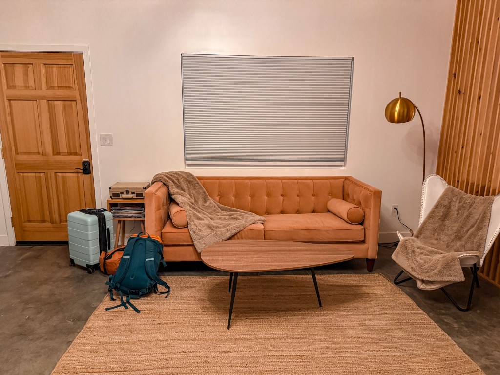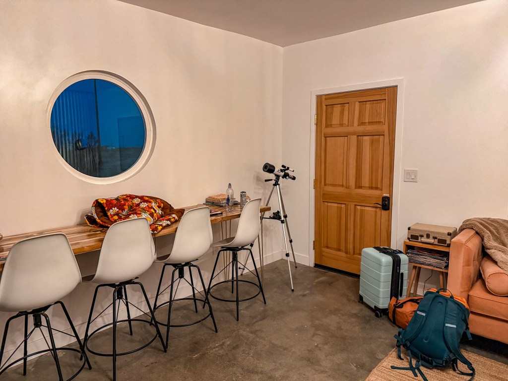 It was also very modern-looking which huge, almost portal looking windows to allow the desert sun to illuminate the space in an other-worldly light. It was one big space, so we also very much enjoyed the open concept of it. Lastly, for inside, there was a telescope and record player provided, and while we definitely made good use of the record player and provided albums, we weren’t ever able to figure out how to operate the telescope properly.