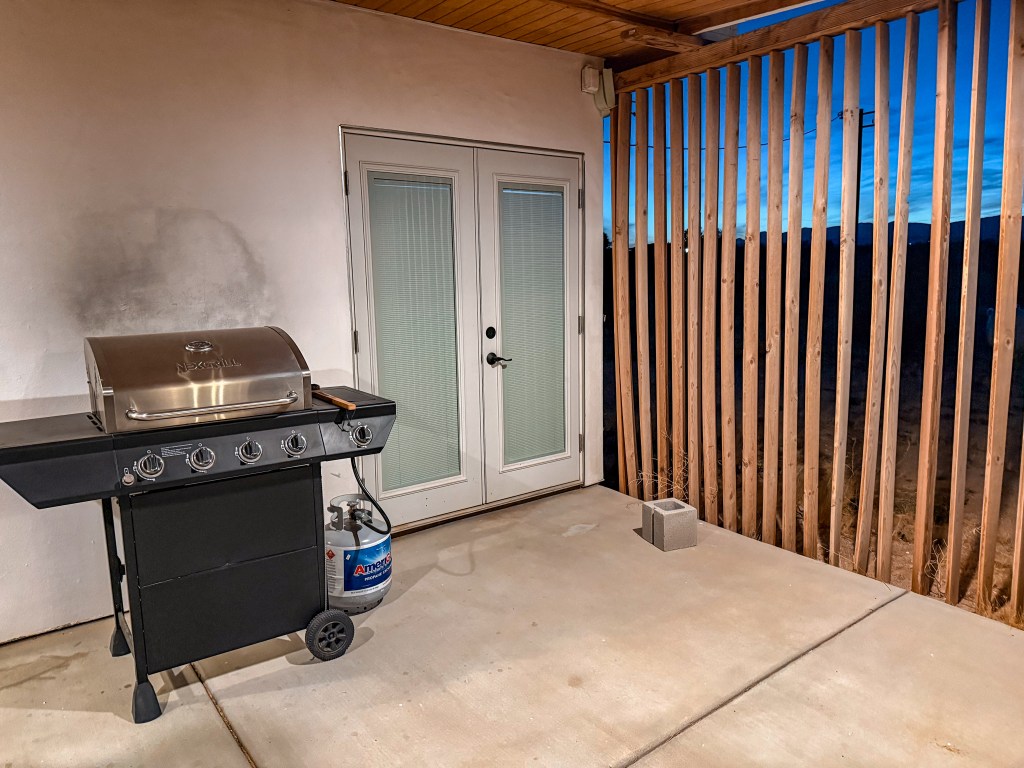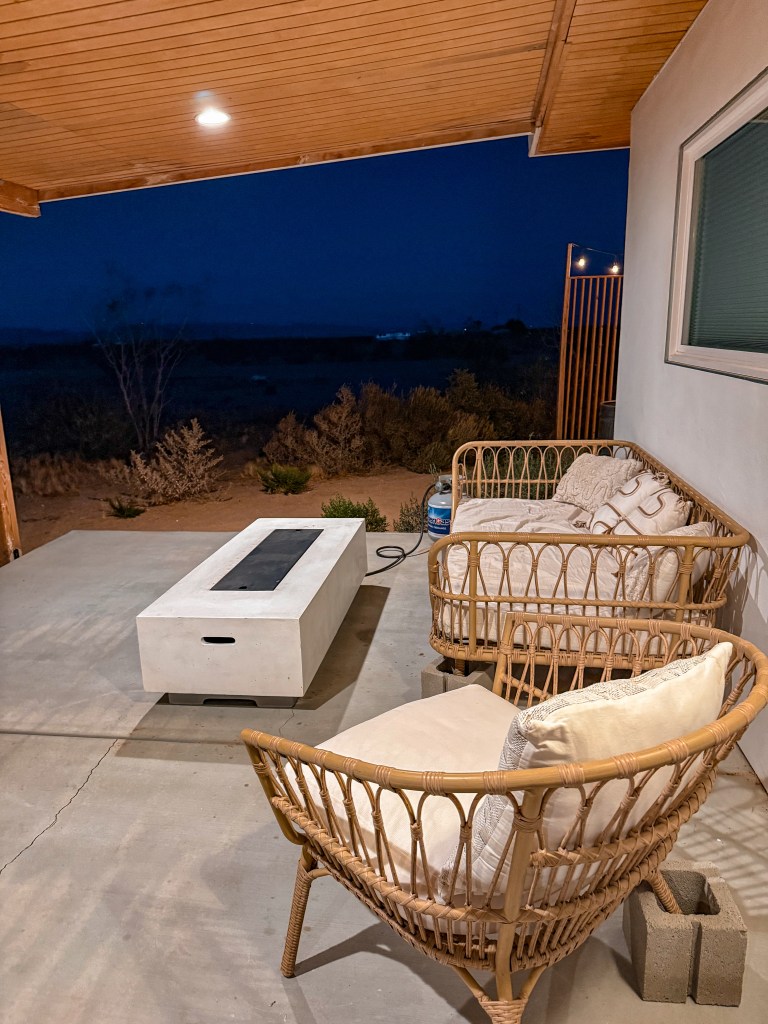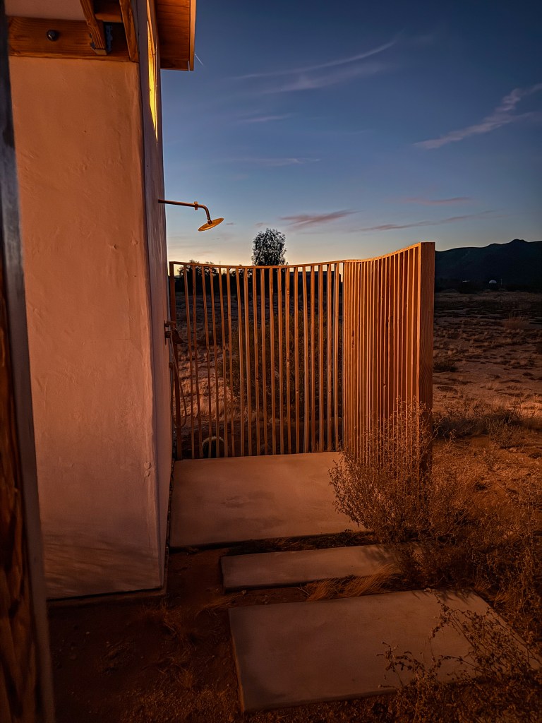 Right off the back of the building, there is an outdoor coach with a large, electric fireplace to sit out and enjoy the desert chill without being too chilly and uncomfortable yourself and also hopefully keep any curious wildlife at bay. Looking at the other side of the back of our abode, on the right side if you are facing it, there were two double glass doors. These doors actually opened up into the bathroom, specifically the shower, so that we actually had the option to shower with the doors open and enjoy a view of the vast desert while soaking up either the heat or cool of the shower water!