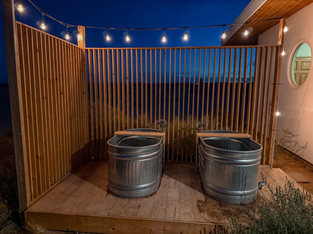 The last amenity that was tucked in directly to the main building was actually a deck, where two side by side outdoor bath tubs were set up! They were HUGE, and the plumping allowed to choose either hot or cold water to fill the tubs with. This meant they could either be an ice bath or a hot tub, depending on what mood we were in! There were beautiful string lights hung up around a privacy partition that illuminated us with a warm light but kept it more a secret for just us if anyone were to drive by.