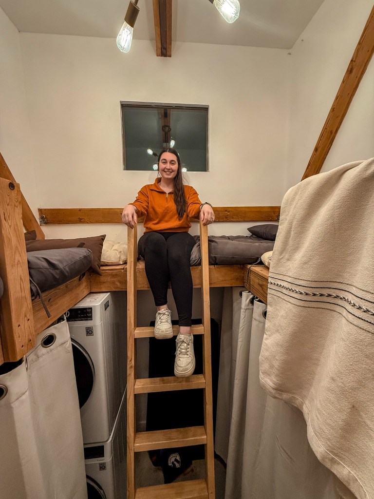 When you walk in, the lower level of the tower actually has some storage space and a washer and dryer available. Then there is a wooden ladder that leads up to the lofted area with some soft cushions and blankets, and an air conditioner/heating unit to control the temperature. It would make a great spot to soak up some afternoon sun or dusky moonlight and stars.