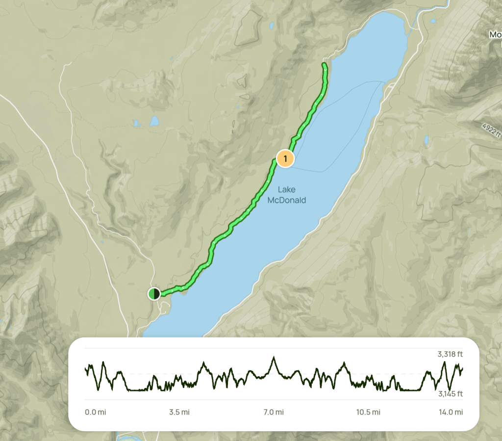 I had been looking at the map for a hike for us to go on. One trail started right near our tent and went to the Lake Macdonald Lodge. I came up with the plan to hike the ~5 miles there in the morning and get there to have a lunch, rest, and make our way back.