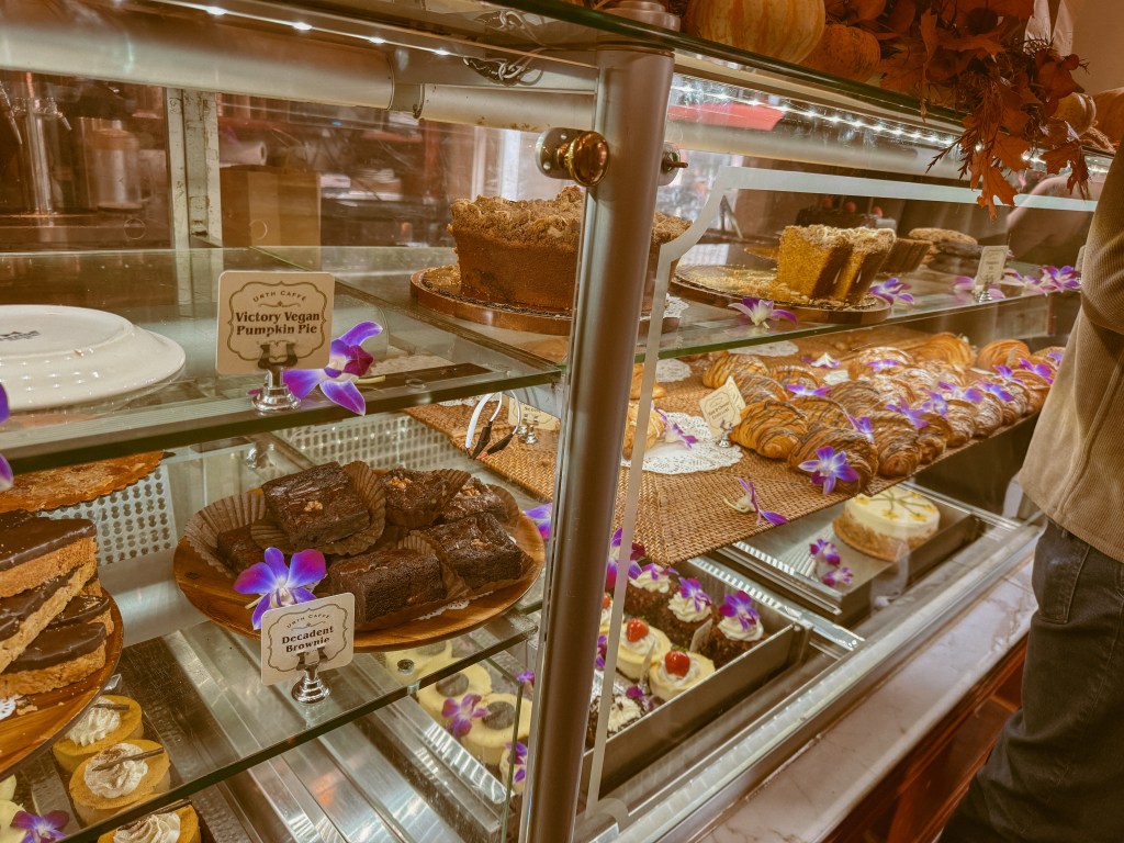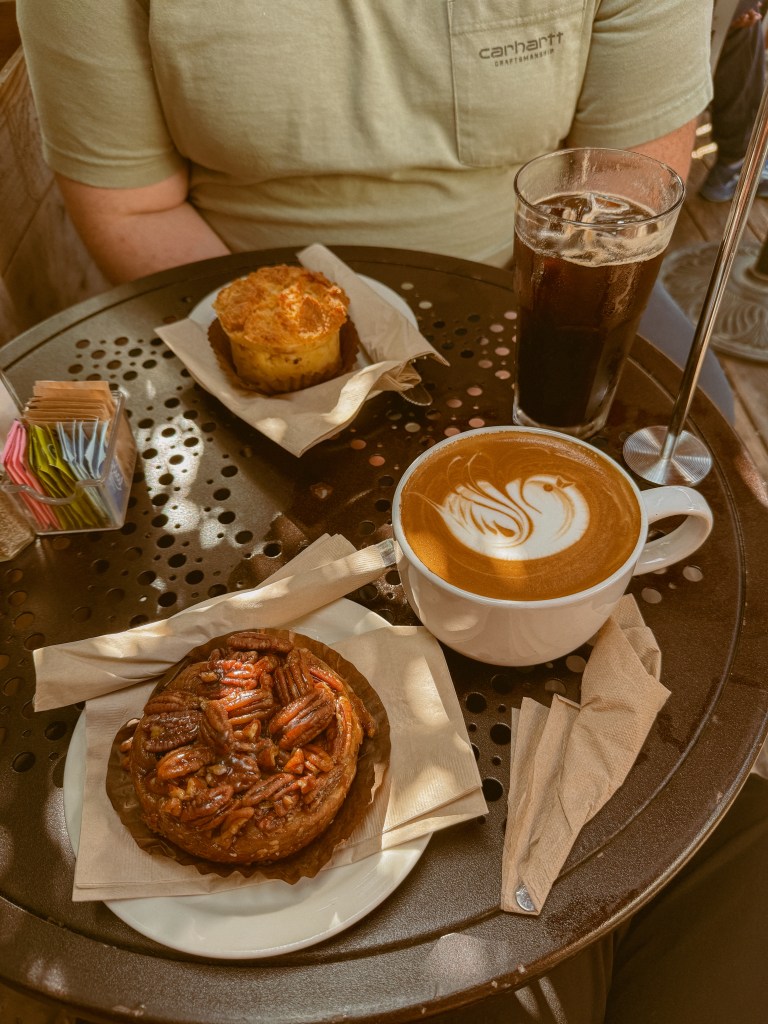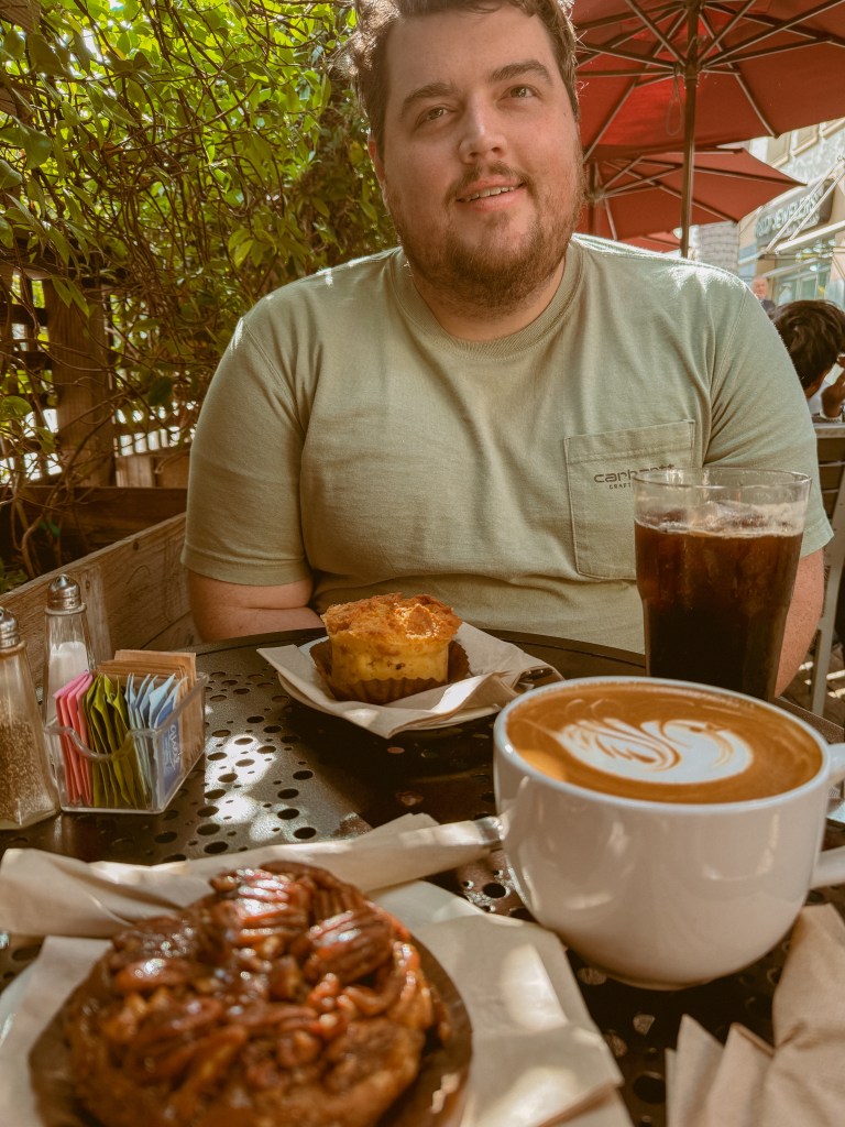 For drinks, I decided to order their highly recommended Italian Cappuccino, an authentic Italian cappuccino prepared by carefully folding thick, creamy frothed milk into espresso. Luke opted to sample a cup of their Urth Cold Brew, their Urth Italia heirloom and organic espresso blend, cold-brewed in-house for 24 hours creating a smooth, rich chocolatey brew. As for food, we each picked out a delectable delight from the display cases. I noticed a mouth-watering pecan sticky bun that I couldn’t pass up, and Luke chose a bread pudding.
