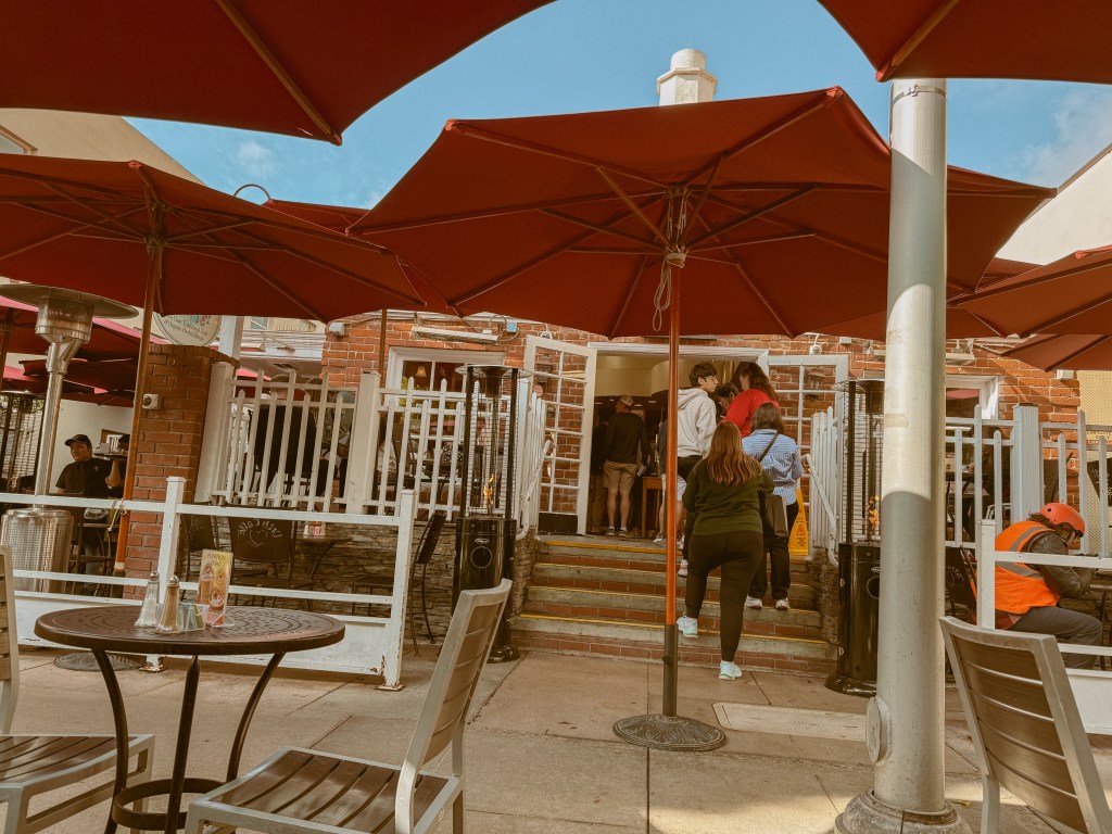 We found a nice little outdoor table to sit in some provided shade beneath large umbrellas. We got to enjoy the sunshine of the day without our skin being painfully scorched by it. There was a privacy fence one one side of us, and the sidewalk and cafe on the other. It made it very easy to people watch while also being able to enjoy our own conversations without the need to raise our voices to talk over excessive noise.
