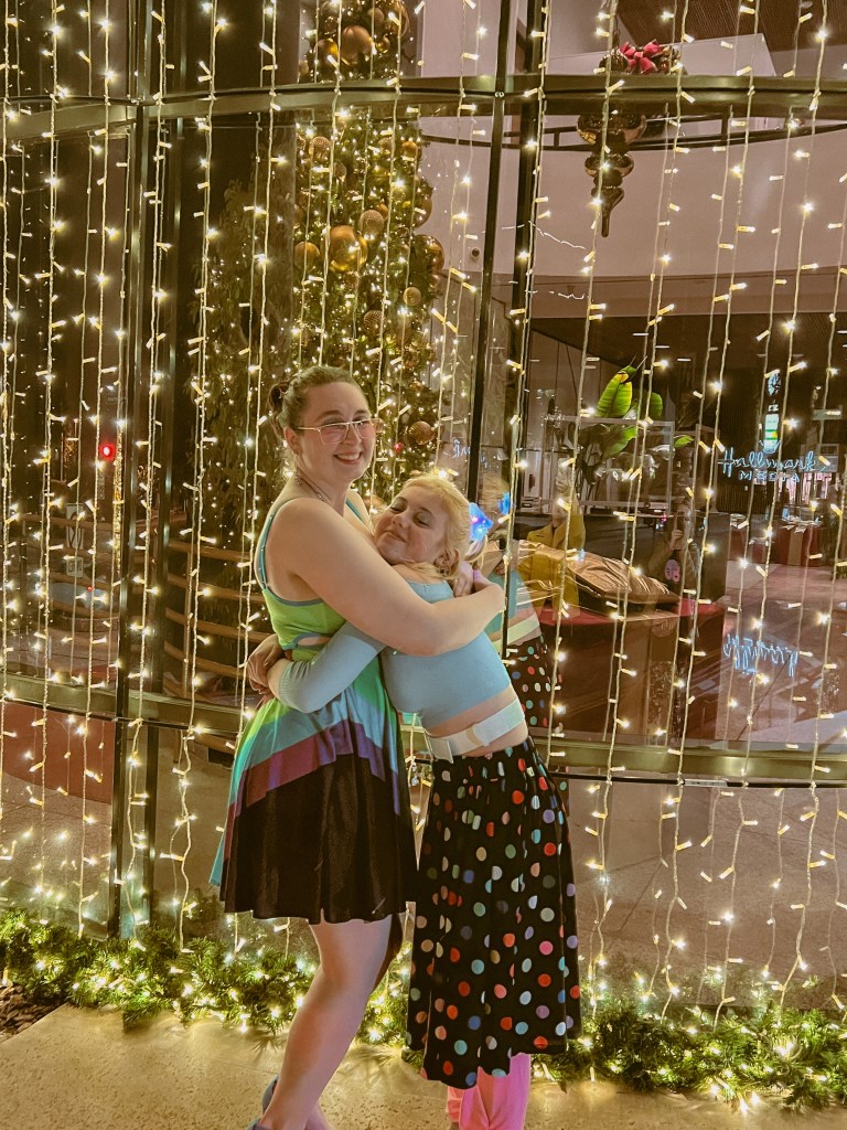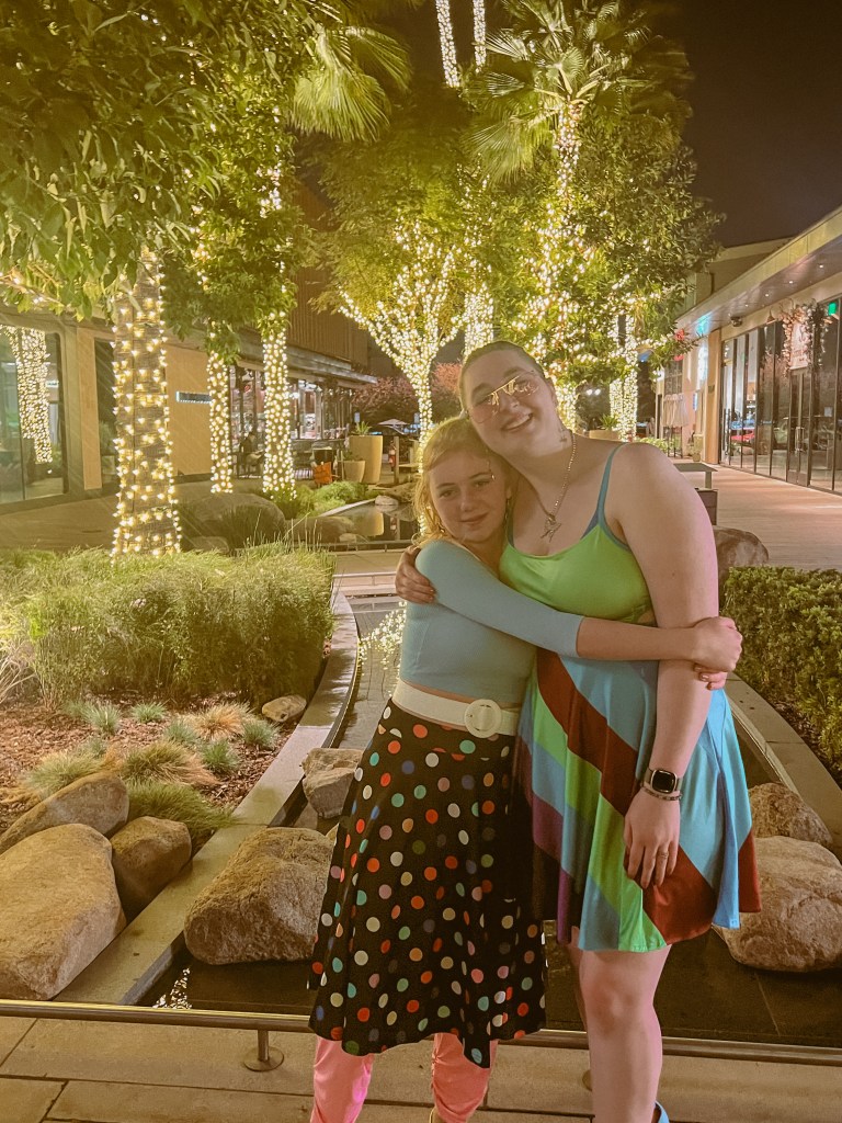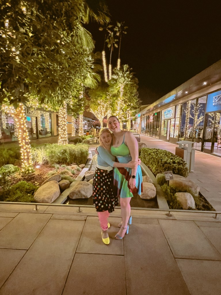 We also were able to sit on the steps of the building and very carefully walk our way around a ledge that wrapped around some flowers and trees that were also decorated with twinkling lights. We got to just be silly and fun and, well…sisters. One of us 13 and supposed to be awkward, and one of us 30 and never really quite grew out of being awkward.