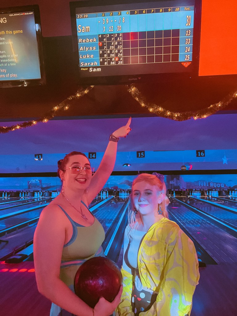 As one does when bowling, we got our names all put in, picked out our bowling ball of choice, and got the ball rolling! With it being late November, the televisions were playing some of the Christmas movie classics, like The Santa Claus while we played. At one point, to further prove the utter and complete serendipity of every small moment and detail that converged to create our 13 Going on 30 event, during one of our games, when we were starting the 4th frame, my score was at exactly 30, and Rebekah was at exactly 13! The universe couldn’t have been screaming any louder at how perfect everything was!