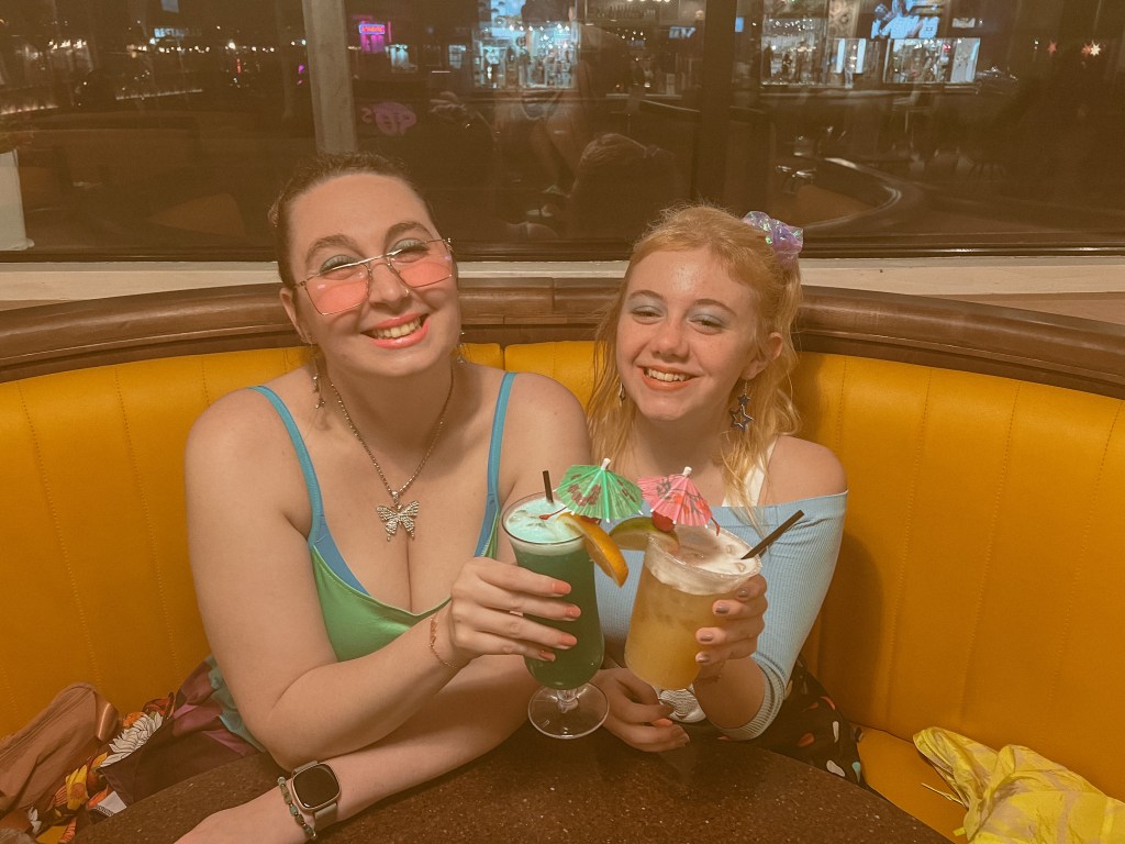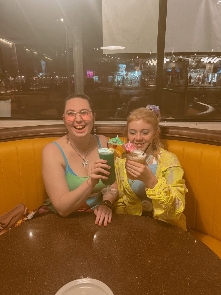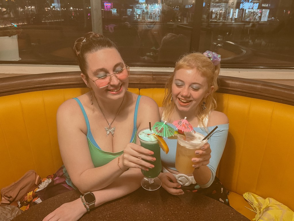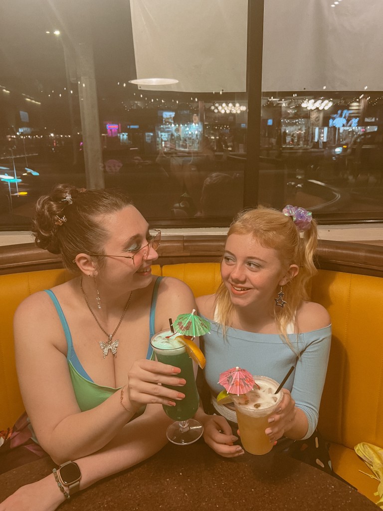 Fortunately, the kitchen and bar is connected directly to the bowling alley, so we decided to grab a seat and drink while we waited. The booths were bright yellow, and we knew the aesthetic would make for some pictures, so it all worked out! The bartender was super nice, and she helped us pick out the perfect birthday cocktails. I got the Blue Hawaiian, which not only sounded delicious, but also matched my outfit! It was a mix of vodka, silver rum, blue curacao, pineapple, and sour mix. She made Rebekah her own little mocktail to go along with her outfit as well.