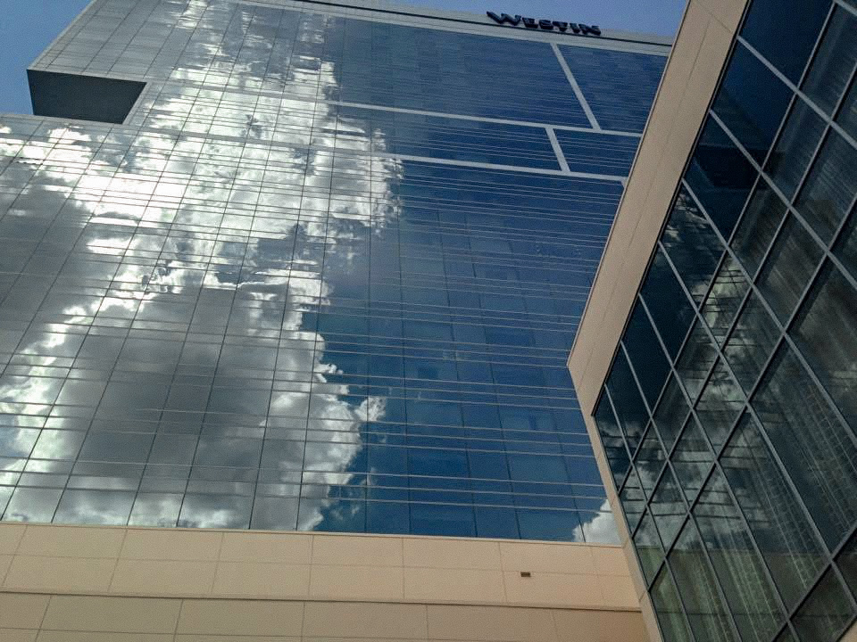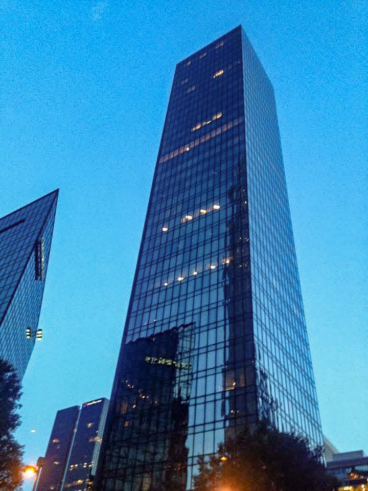 The dusky evening sky absolutely stole my breath away. The faint glowing blue turned the reflective glass buildings into stronger appearing obelisks that jutted out like a mountain as opposed to the way they seemed to lightly tickle the sky when they were surrounded by fluffy clouds.