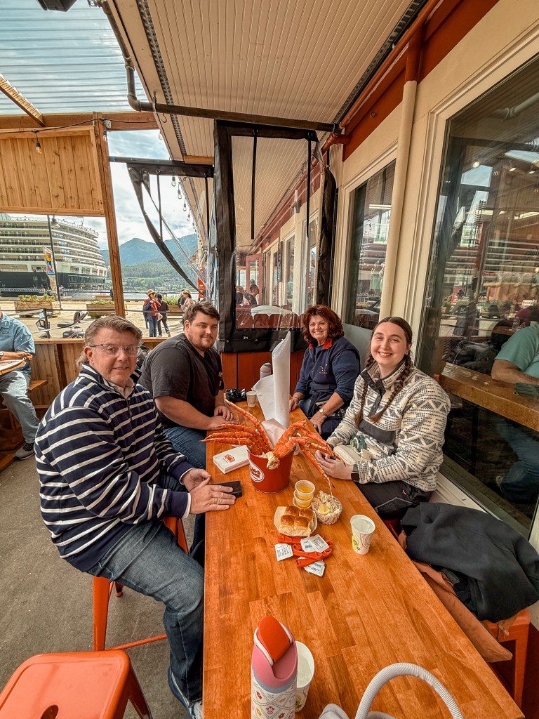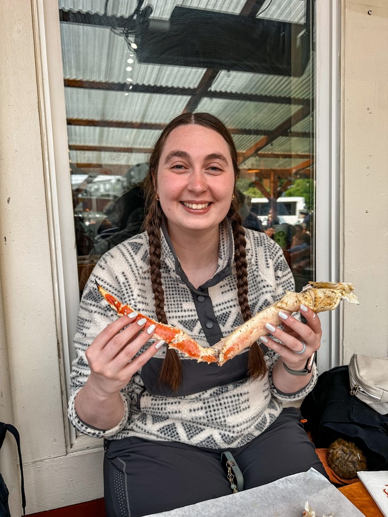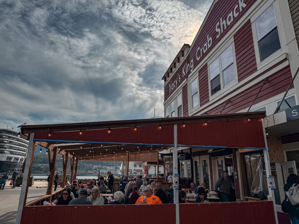 After our excursion, we were brought back to the main strip near the pier and docked cruise ships, where we had another extremely important appointment to keep. While the ship offered fantastic food, there was one special meal we just couldn’t bear to leave Juneau without sampling. We got in line to order some famous Alaskan King Crab from Tracey’s King Crab Shack.