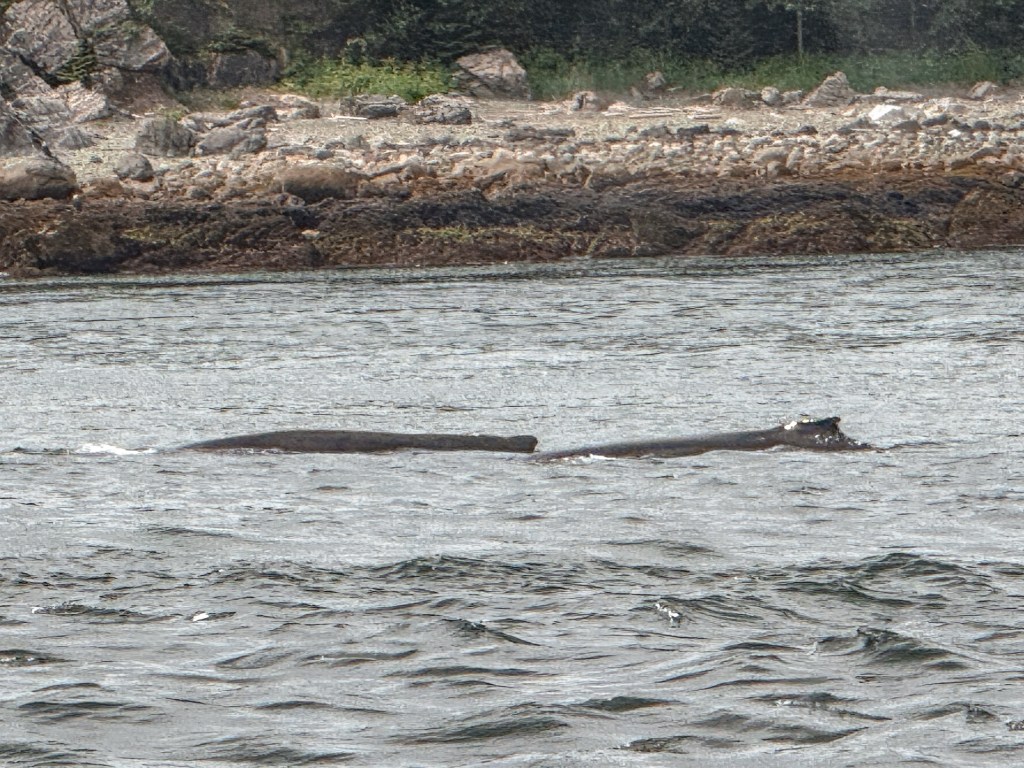 However, we eventually pulled up on another whale sighting, this time a pair of a mother and her calf! This time we had to stand and walk to the other side as they were on the opposite side of the boat to where we were seated. They weren’t nearly as active as Kelp, but it was still very fun and exciting to see two sets of spines and tales hover around the surface for a while. They also didn’t hang around as long as Kelp, and they retreated beneath the surface after only a matter of minutes. We timed it just right!