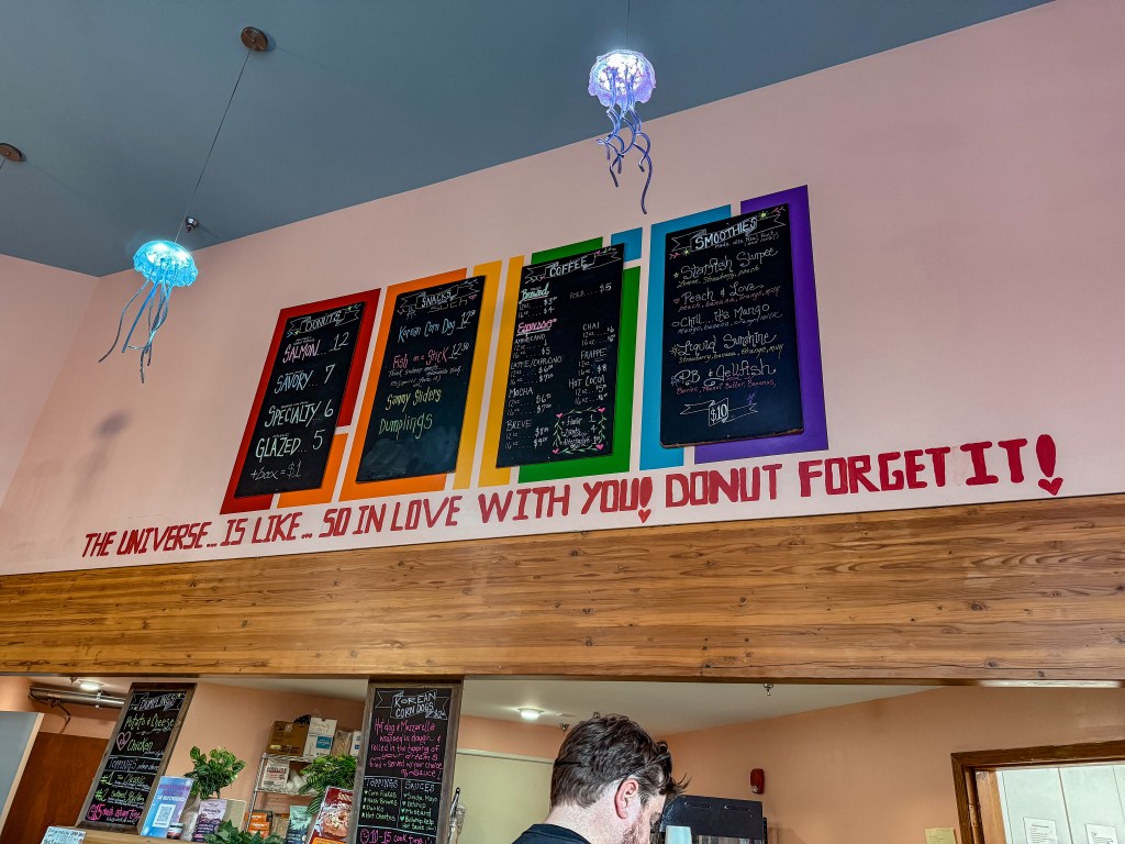 We then made our way to a dessert shop we had come across while checking out vlogs on different things to do or see in Juneau. The place was called Jellyfish Donuts, and as you may well have guessed already, they are known for their wide and tasty array of donuts. We were still extremely full from our crab meal, but we figured these would make a great late-night snack or breakfast, so we went with a half dozen of some of the ones we thought looked the tastiest before continuing on our way.