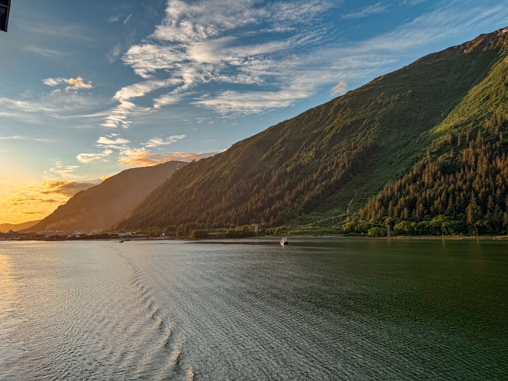 We still had about an hour before we would be pulling away from Juneau, so this allowed us to enjoy one of the most perfect evenings out on our balconies that we could have possibly asked for. The setting sun cast the most beautiful golden light across the water, trees, and mountains, making everything glow and shimmer. Even the docked boats just resting in the harbor looked like a fairytale brought to life by the magic of the sun’s rays.