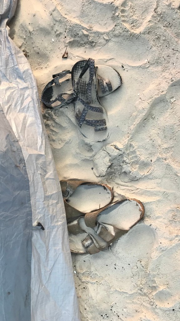 It still makes me smile thinking how unpleasant it was. Miserable in the moment, but one of my favorite stories now. The picture is of Sam and my sandals just outside of our tent. Those were my favorite Birkenstocks and it was only after the trip that I realized that I had left the in the sand that day when we packed up. Call it an offering to the beach as a thank you and definitely not littering.