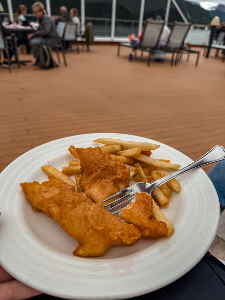 I grabbed a nice plate of some classic fish and chips, and it was very pleasant. We ate swiftly and made our way to the World Stage so that we could see Alaska Native Voices: Stories of the Tlingit People. One of the members of the Tlingit tribe had also boarded the boat like the park rangers, and he gave a 45 minute presentation on the Tlingit history, traditions, stories, and it all culminated in a performance that involved a traditional chant and hand drum. I absolutely loved it and greatly appreciate the stories and traditions of indigenous peoples from all around the country.
