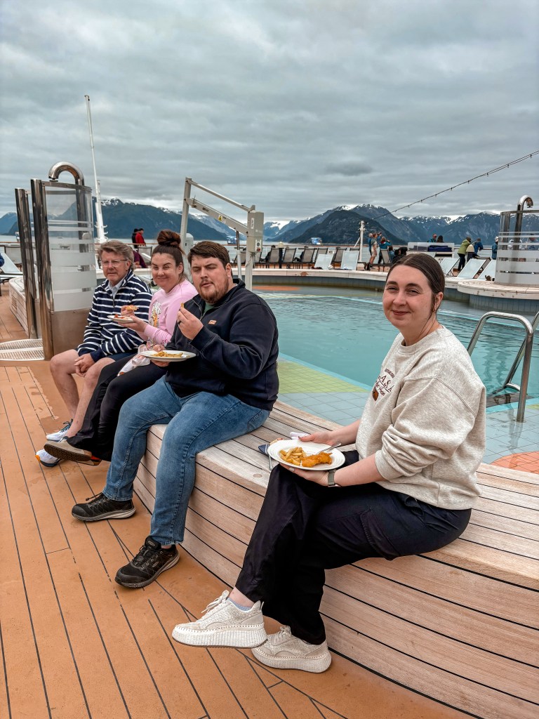 Just before 1:00, it was time for some lunch. Because everyone was boarded on the ship instead of sharing time between ports/land and the boat as well as everyone wanting to have constant eyes on the landscape, the Lido Deck and its tables were completely full. We made it work by swinging through to grab our food and finding a spot outside next to the pool to sit and eat a quick meal, which worked since we had a program we wanted to catch at 1:30.