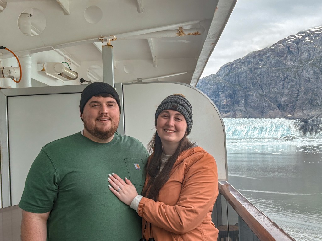 To end the evening, we made our way back to our cabin to take some pictures while we were still all dressed up and with our surprise anniversary cake. We couldn’t have asked for a better backdrop with the enormous expanse of Alaskan water behind us as the setting sun painted the sky a little gold and the waters a sparkling blue.