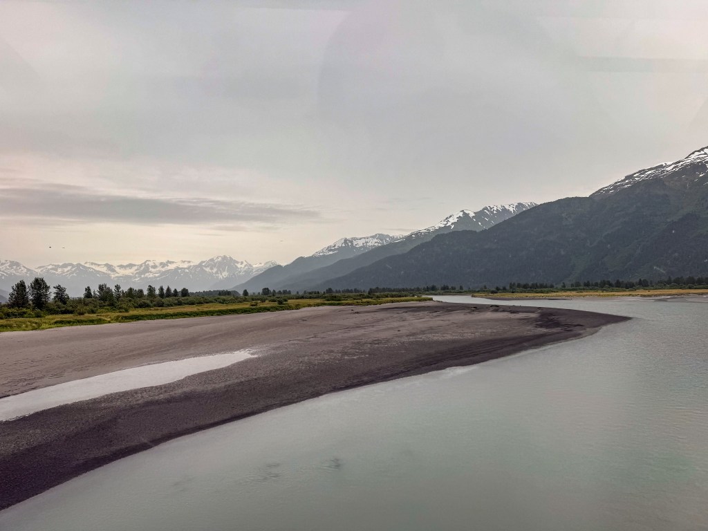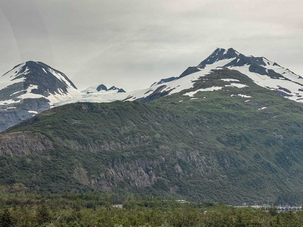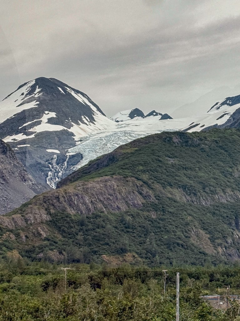 We were on the train by 8:30 and slowly starting to roll out. Even before we reached the singular tunnel that would take us out, we were getting the full expanse of what the Alaskan terrain had to offer. We were surrounded by rolling mountains licked by the tongues of glaciers. The rocky peaks and crystal white snow and ice stood out against the unbelievably green grass and trees.