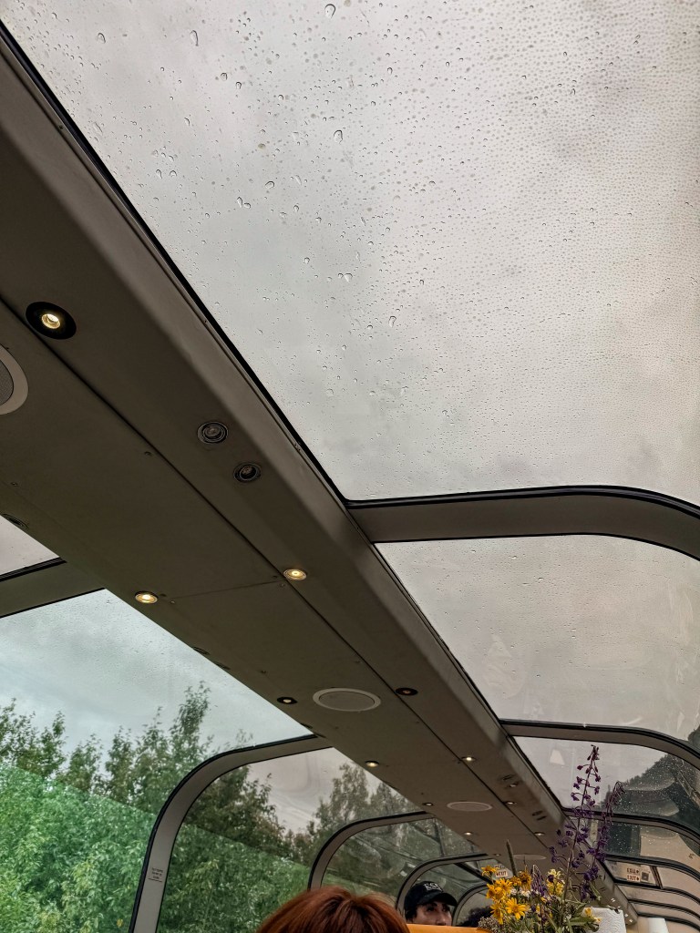 As we continued the two and a half hour journey to Anchorage, some big gray clouds carrying rain floated overhead. However, we were nice and dry inside, and the rain brought an absolutely mystical ambiance with the class domed ceiling.