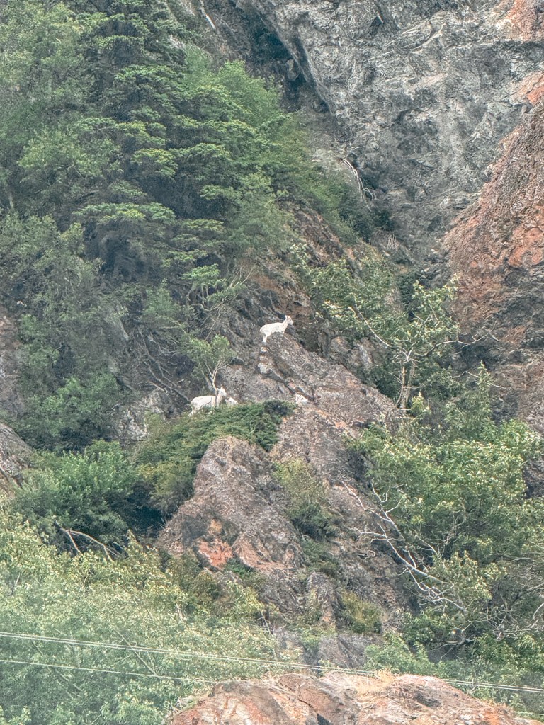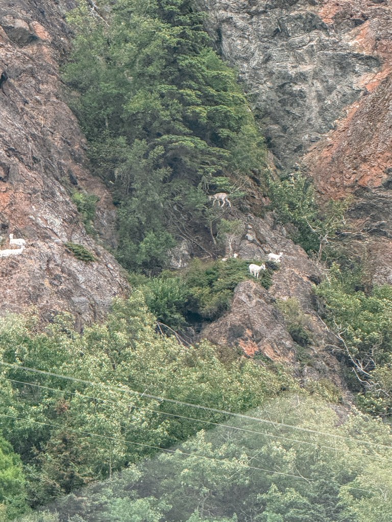 We were also able to spot a couple different herds of Dall sheep scaling the cliff sides. Dall sheep are native to the mountainous regions of Alaska, western Canada, and the Yukon and are known for their white fur and large curled horns.