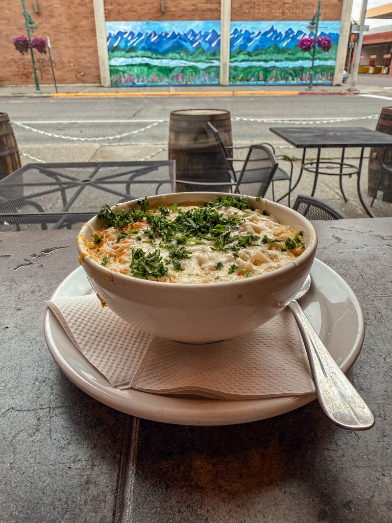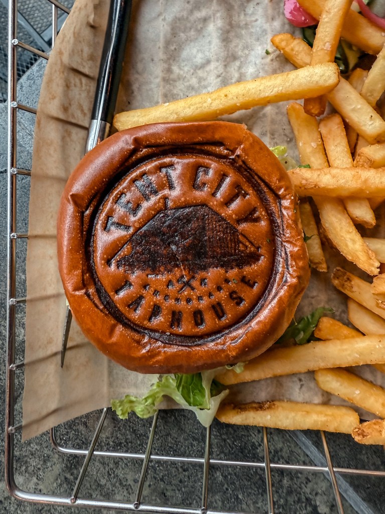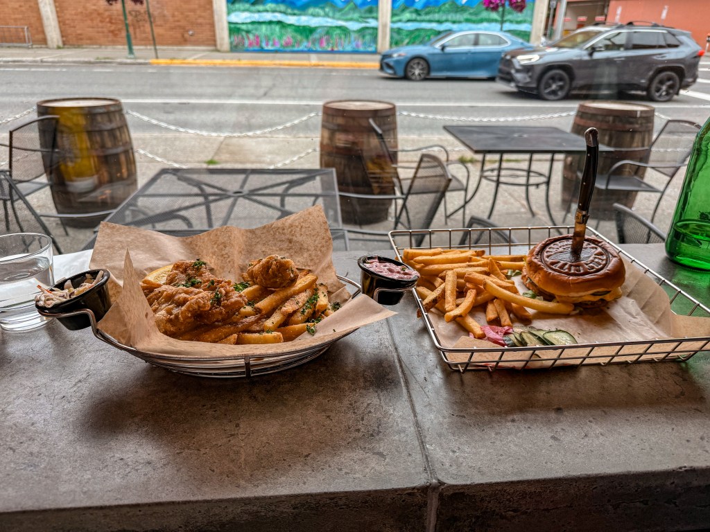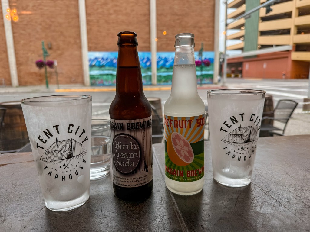 We started with drinks. We wanted to try out something local since we had come all this way, so we sampled their Turnagain Brewing Grapefruit Soda and their Turnagain Brewing Birch Cream Soda. For food, I got the Alaska Halibut and Chips, and Luke got the Tent City Burger, which came with a very cool branded bun! He also made sure to order a side of Kase Spatzle when he saw it on the menu! I’d never heard of it until then, but it’s a German and Austrian comfort food that is basically like a fancy mac-and-cheese made with egg noodles.